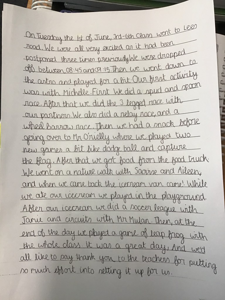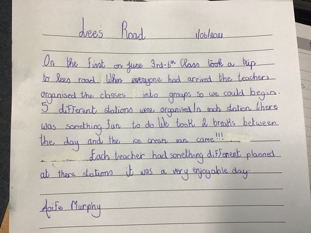 Activities and Great Fun at Lee’s Road for 3rd to 6th Class Posted on June 2, 2021 by knockanean Thank you to the teachers for organising a fun activity day for the 3rd, 4th, 5th and 6th class in Lee’s road this week. Some photos from the day! Reviews of the day, written by 6th class students, Aoibheann Moore and Aoife Muphy By Aoibheann Moore 6th Class By Aoife Murphy 6th Class Share this: Click to share on X (Opens in new window) X Click to share on Facebook (Opens in new window) Facebook Like Loading... Related