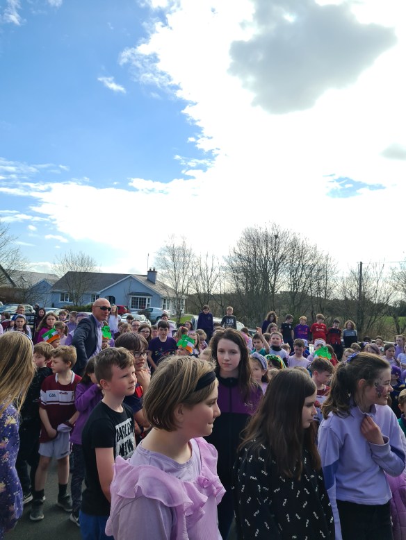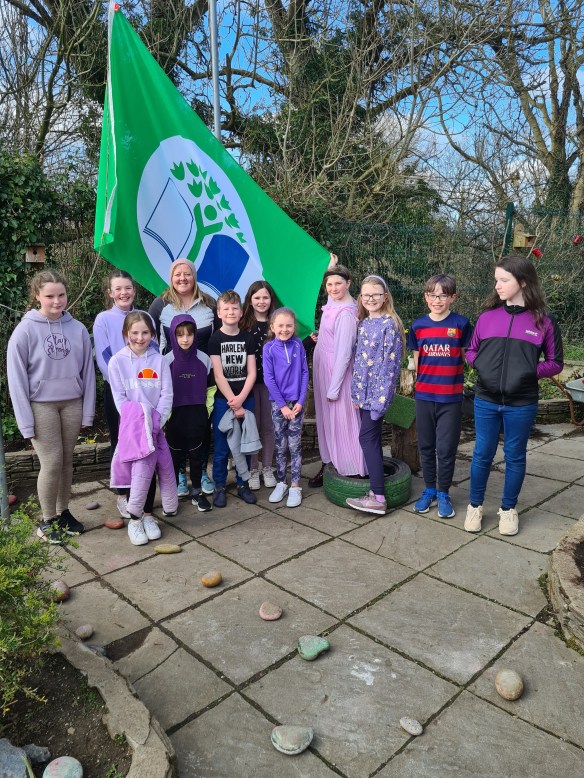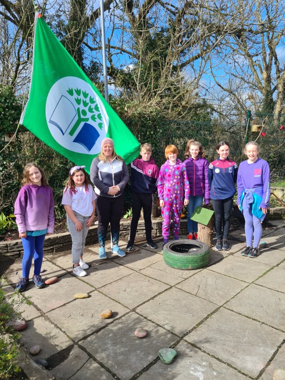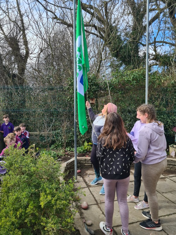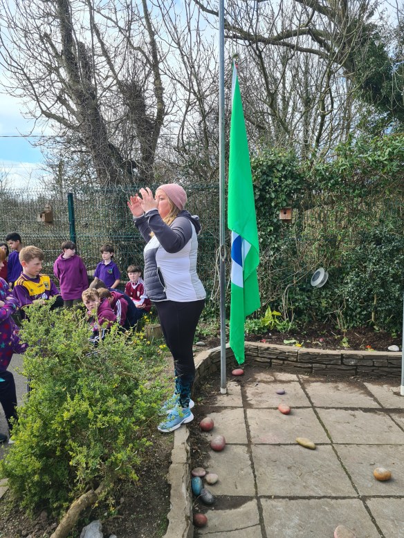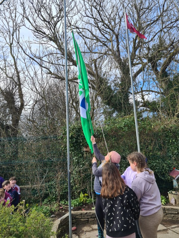 On March 16th we were presented with our Green Flag for travel by Róisín Garvey. For the Green Flag we started two walking buses every Tuesday and Friday. Over a hundred people walked to school one day. When Róisín Garvey raised the Green flag the whole school came to the front and watched as she raised it.