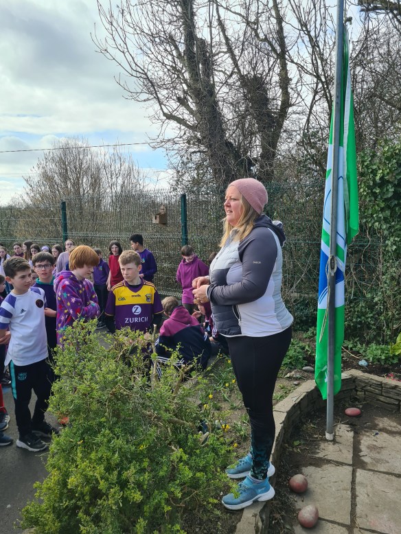 Róisín Garvey took a few pictures with the green school’s committee and we had a good time with the other classes. The whole school and parents were praised for their efforts. All classes made a huge improvement with keeping the yard litter free and by picking up the rubbish several times a week.