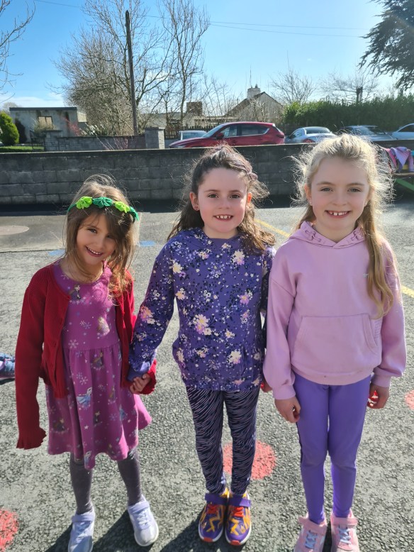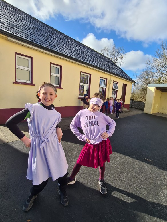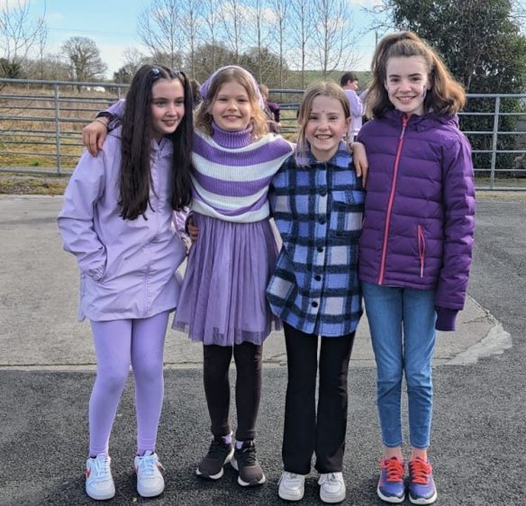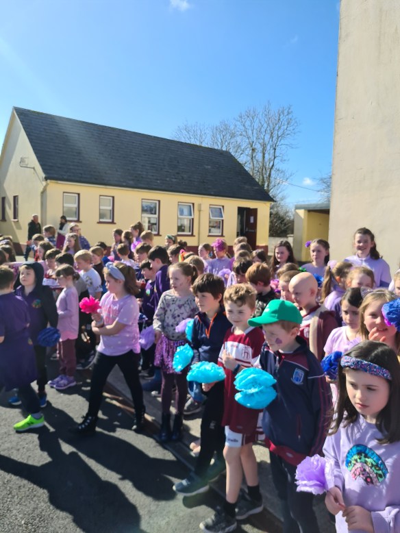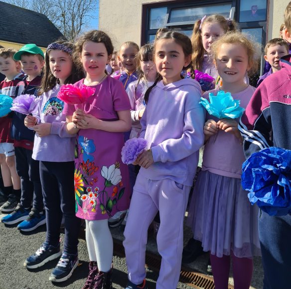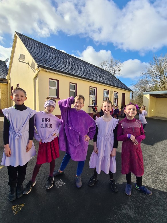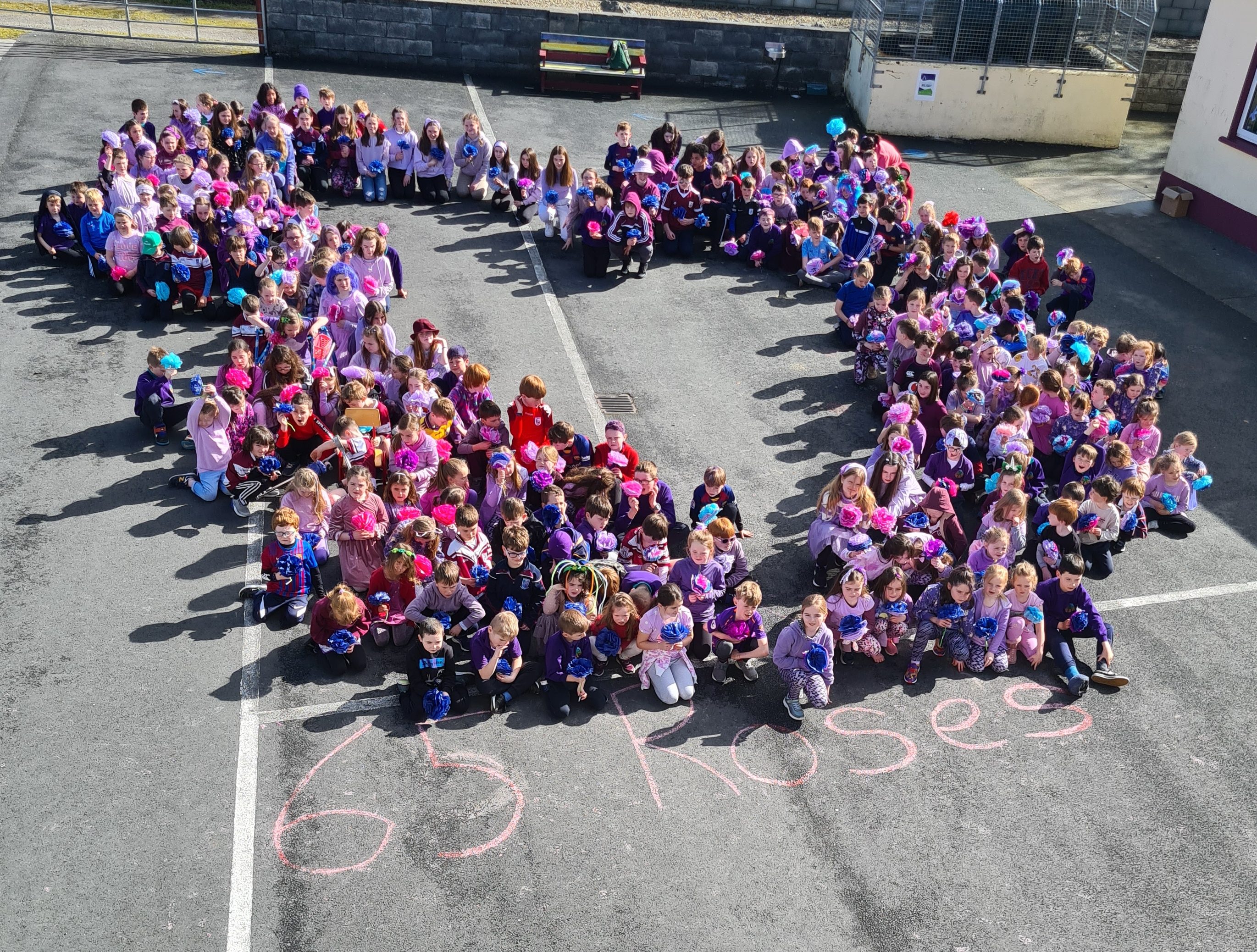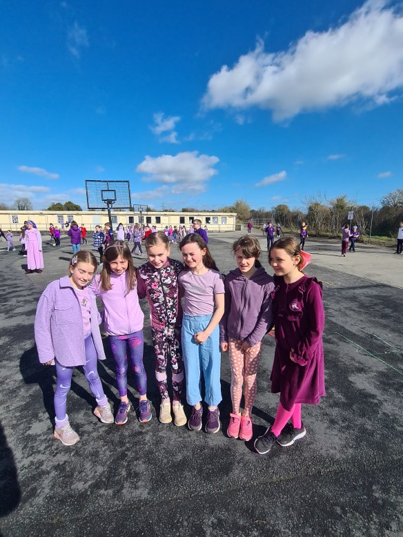 On purple ribbon day, we raised awareness for people with cystic fibrosis. All the children wore purple. We decorated purple ribbons and roses for the windows. We made roses out of tissue paper. On the day, the whole school stood in the shape of a heart, holding their tissue paper roses. Then the whole school paused for a mindful silence. After that, first and second class and the choir sang the 65 roses song composed by Amy. We took lots of photos and had a disco at lunchtime.