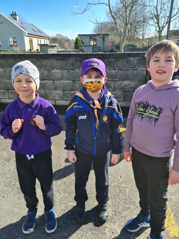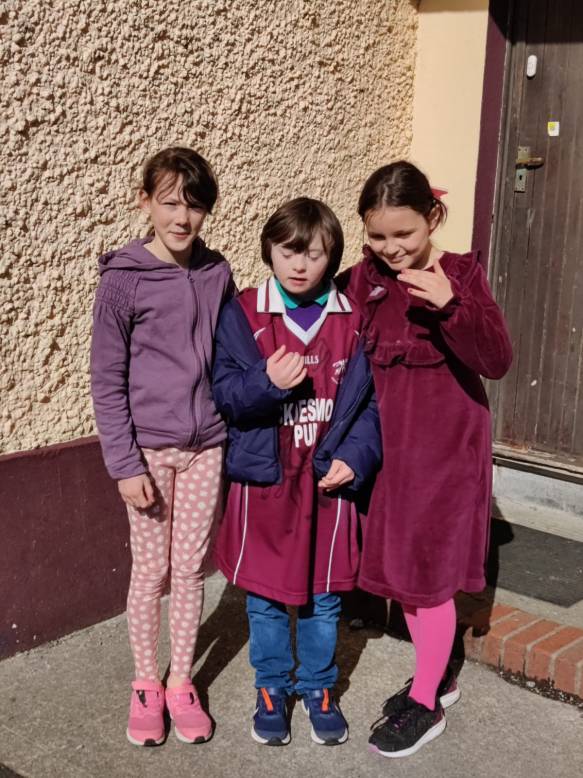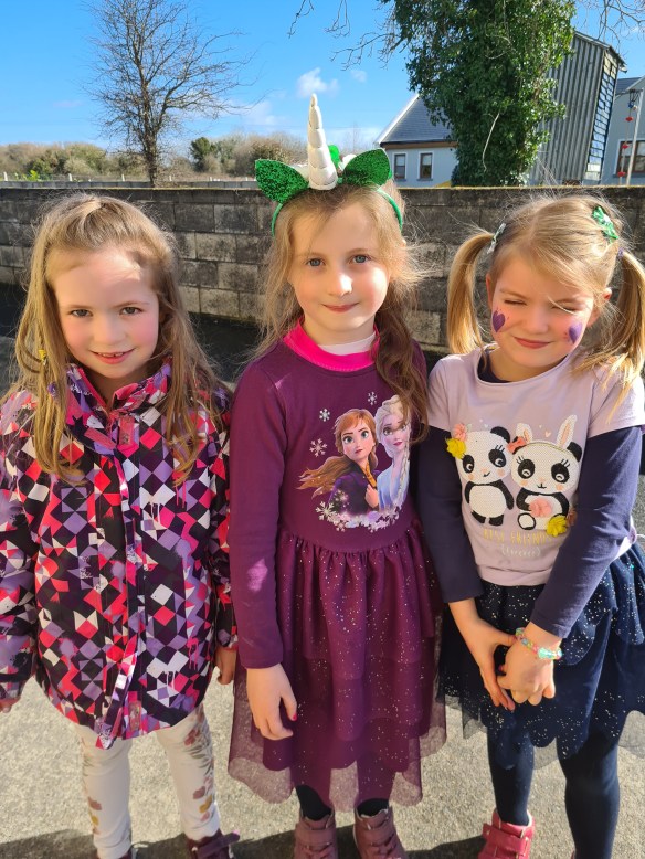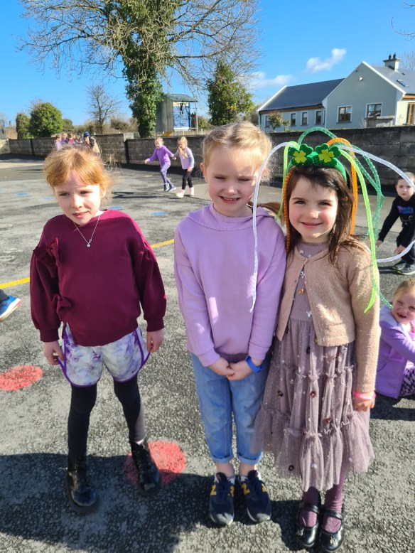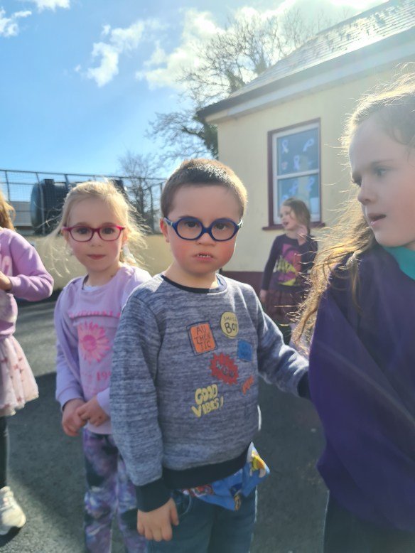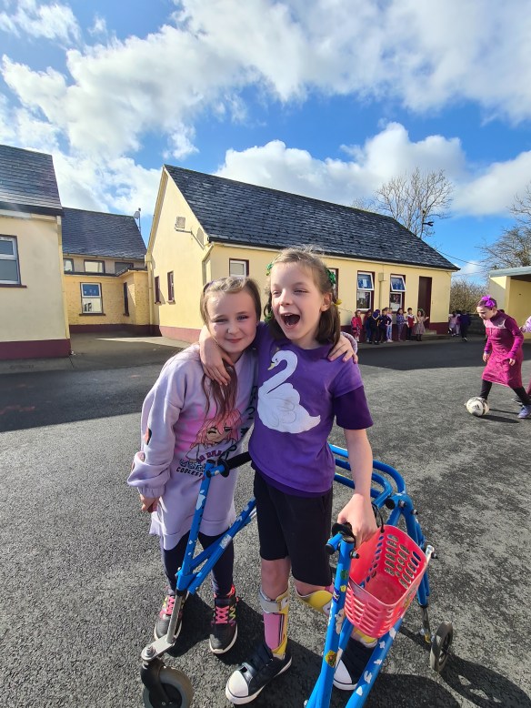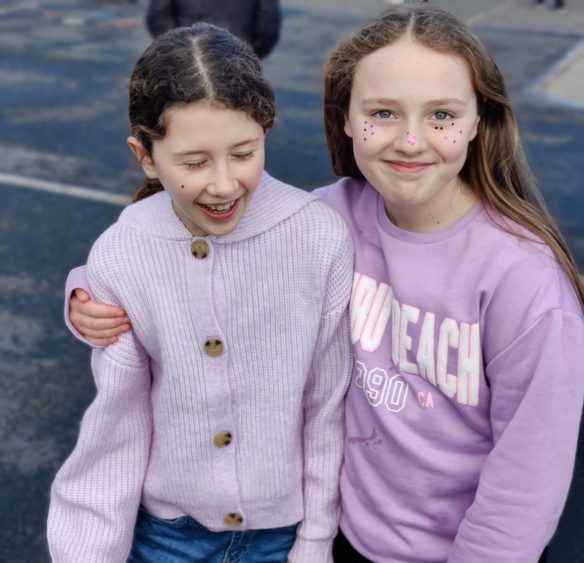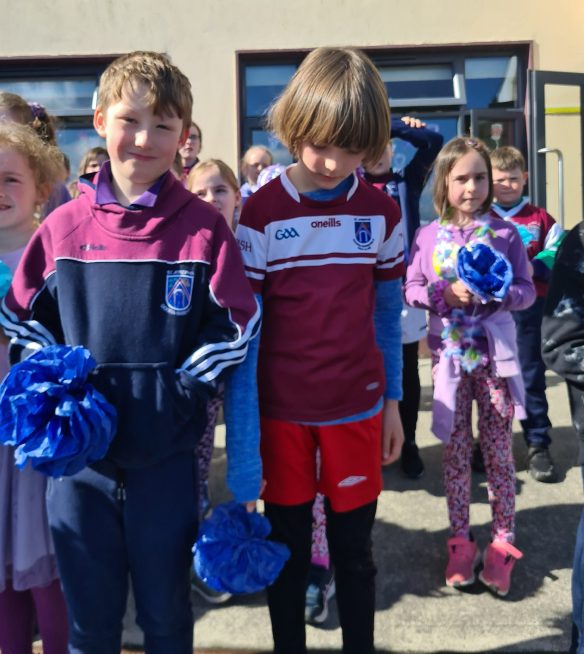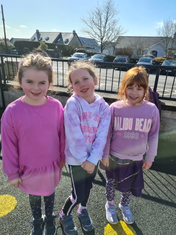 On purple ribbon day, we raised awareness for people with cystic fibrosis. All the children wore purple. We decorated purple ribbons and roses for the windows. We made roses out of tissue paper. On the day, the whole school stood in the shape of a heart, holding their tissue paper roses. Then the whole school paused for a mindful silence. After that, first and second class and the choir sang the 65 roses song composed by Amy. We took lots of photos and had a disco at lunchtime.