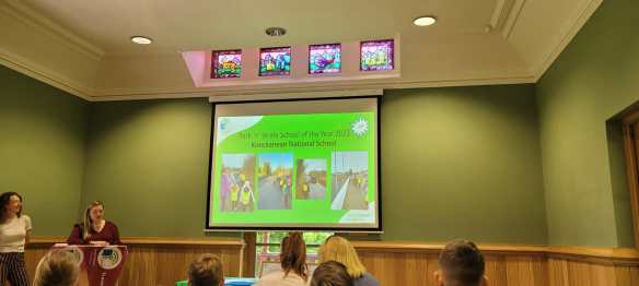 On May 19th we went to Dublin Zoo with Amy and Mr Curran to collect an award we won in the Big Travel Challenge. We won the award for “Park ‘n’ Stride school of the year. When we got there we had croissants, pastries, fruit and drinks. We also received a bag each with souvenirs. At the awards ceremony each of the 8 schools present, received their award in the various different categories. After the ceremony, each school had their photo taken individually and then there was a group photo. During the ceremony, there was a sideshow of the efforts each school went to. After lunch, we were free to walk around the zoo and look at the various animals and attractions. We had an amazing day in Dublin!