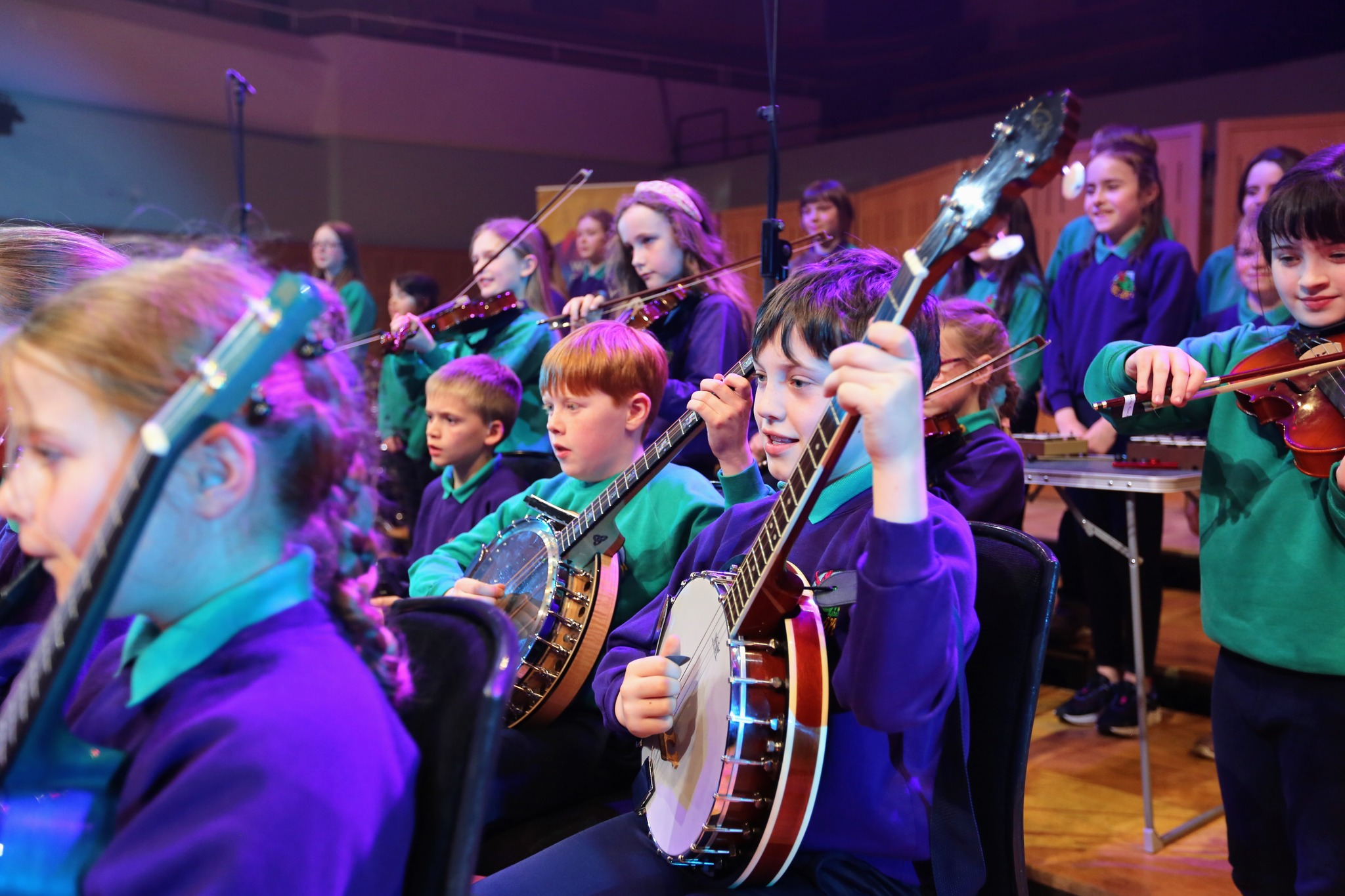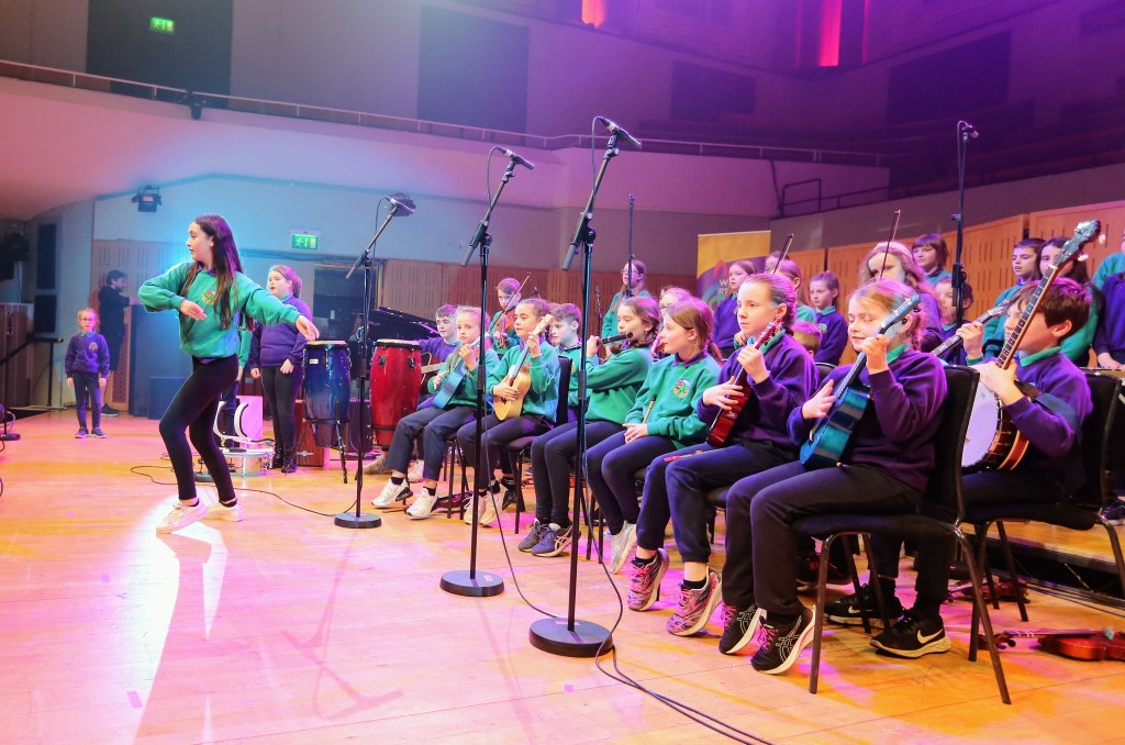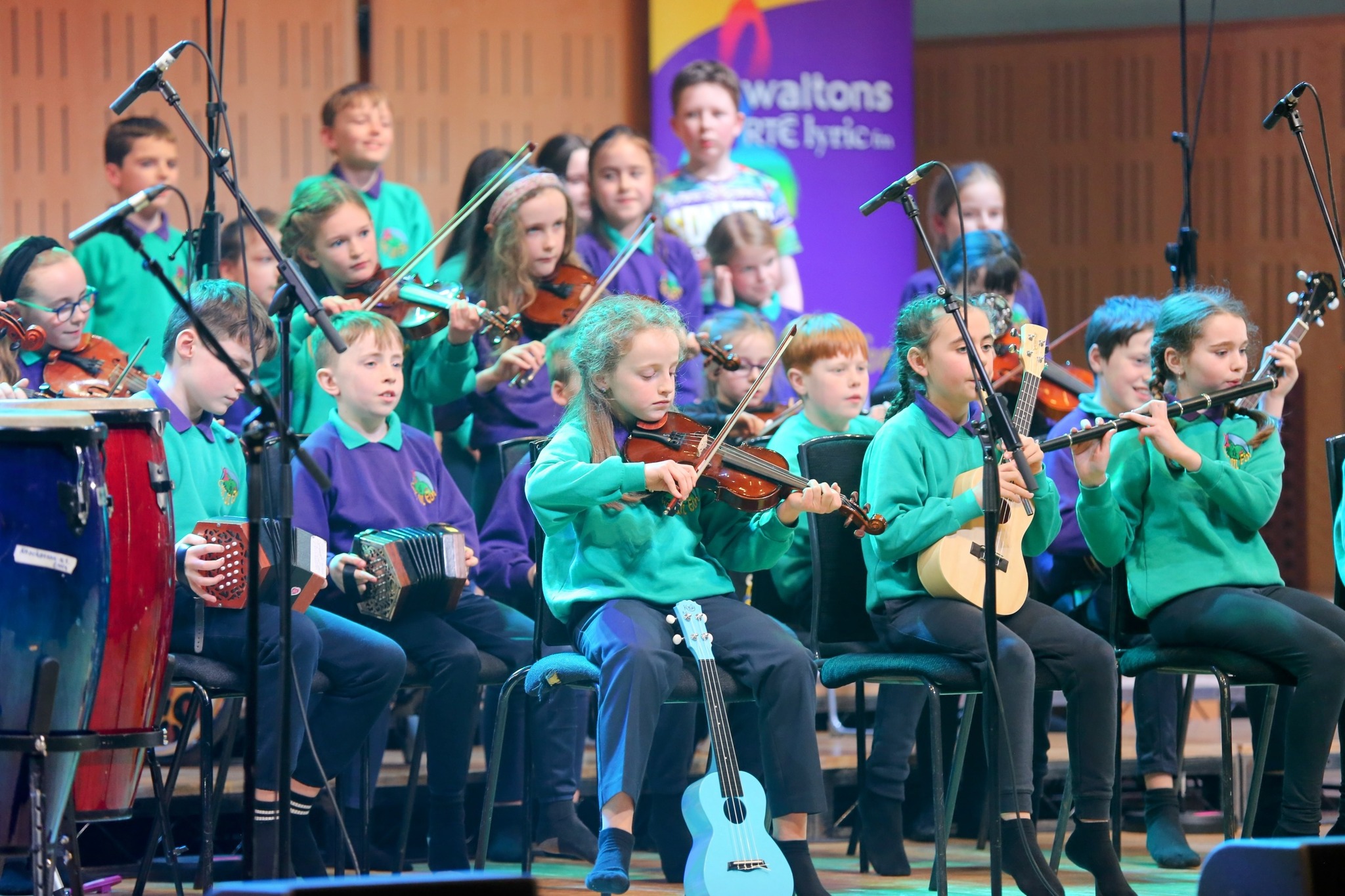 On Monday the 8th of April, the Waltons group from Knockanean N.S. travelled up to the National Concert Hall in Dublin for the final of the Waltons Music for Schools competition. We gathered at the school at quarter to seven in the morning. We then travelled the long journey up to Dublin on the bus. Several teachers accompanied us on the day- Amy, Tina, Louise, Conor, Aileen, Fiona, and Mr. Curran. We arrived at the National Concert Hall at around half past eleven, and we gathered in a room and did a sound check to trial run our performance. After the sound check we had a bit of lunch and then the whole competition began at one o’clock. We found out that we would be the second last group performing on the day. There were six primary schools, six secondary schools and a special school also performing in the competition. Luckily, we had great seats in the front row of the hall. We watched the beginning performances and we soon realised that there was a very tough competition! The other performances were very energetic and it was nice to see the different genres of music and how they responded to the theme of ‘Music Moves us’.