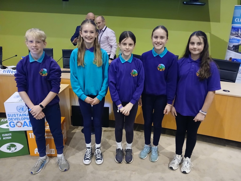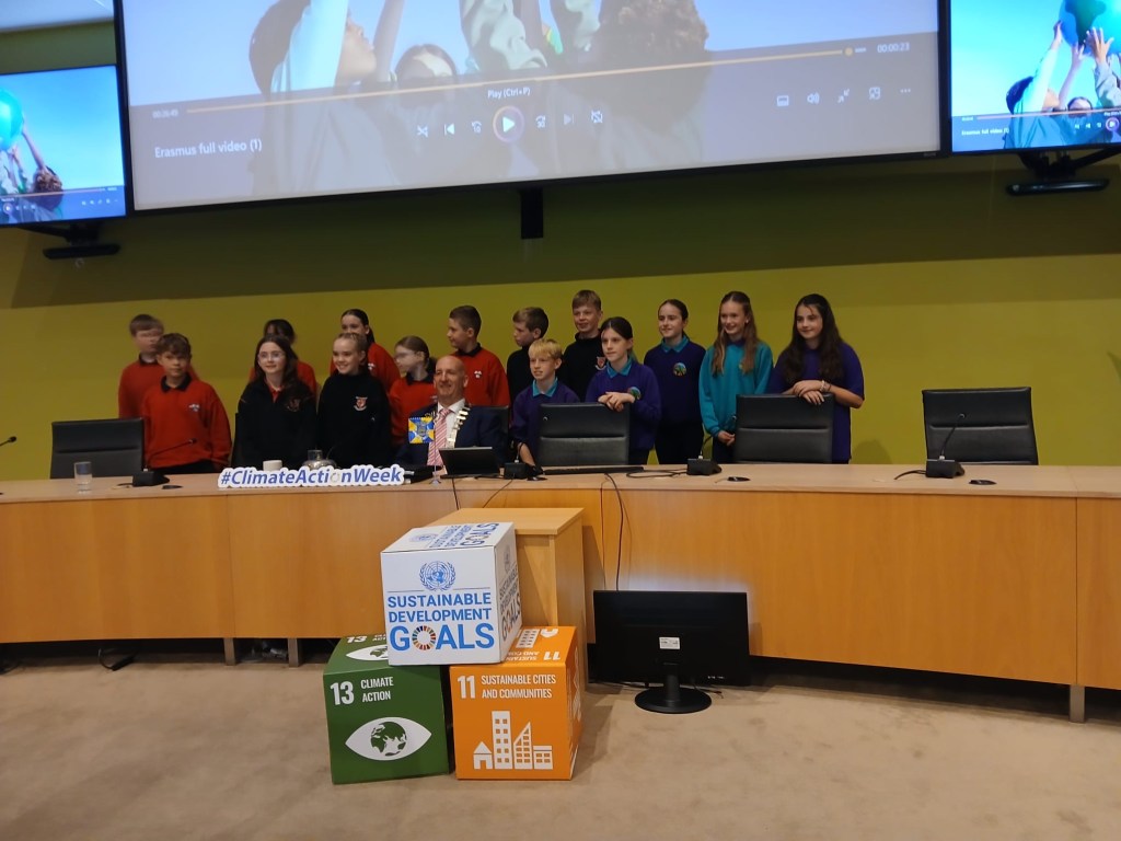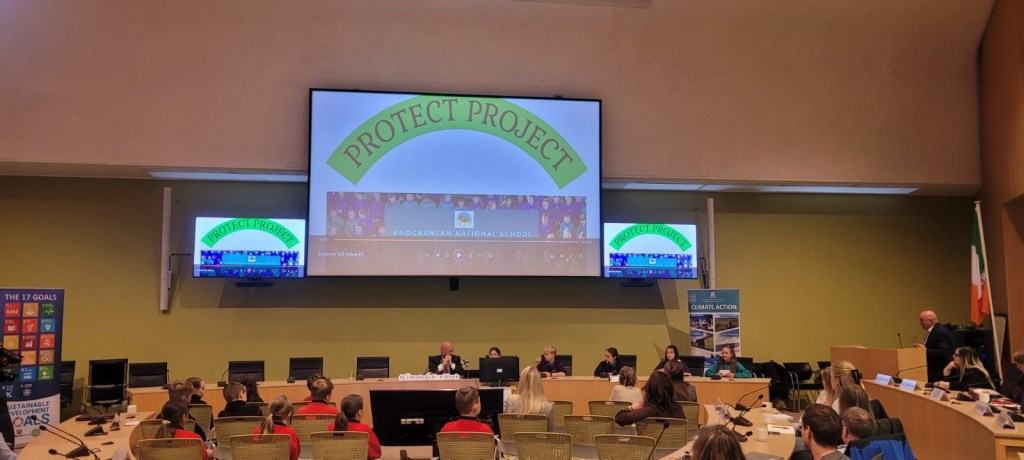 The video was about four minutes long, and we added music and pictures to the video as well. The video was played in the Council Chamber Hall on Wednesday the 15th of October, and five pupils from the school- Luke Callinan, Beibhinn Curran, Croíadh Barry, Alison Casey and Ellie O’Brien attended the Chamber Hall to speak about climate change. Overall, we really enjoyed engaging in the PROTECT project, and we look forward to the next stages of the project which involves learning more about aspects of climate change in school.