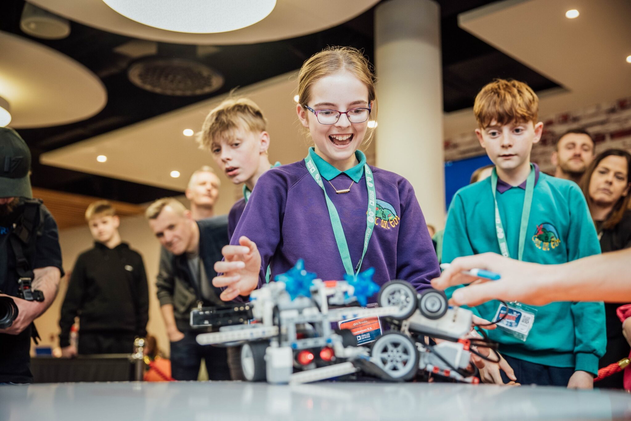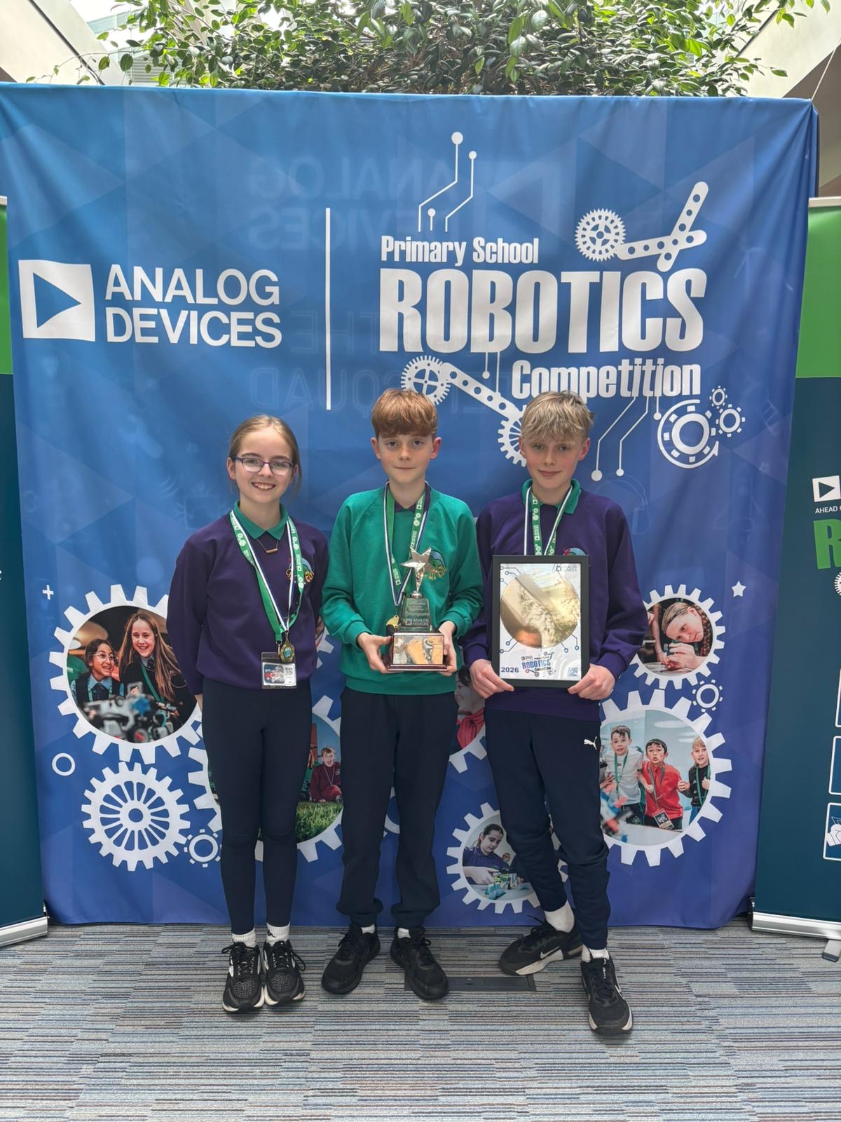 On Saturday the 18th of April we competed in the Munster Analog Devices Primary School Robotics Competition. This competition took place in the Analog Devices building in Limerick. When we arrived we collected our team poster from our teacher Conor. This poster was all about archaeology and how robots can help archaeologists. We were then shown to our table and on our table was a computer and a box of lego spike. The host then announced that we were going to be making sumo wrestling robots on the day. We were very excited when we heard this! We then had two to three hours to build a base model and armour. After this we tested out our robot on other teams in practise matches. It performed very well during these matches. We then had a short break for lunch and after that we began the group matches.