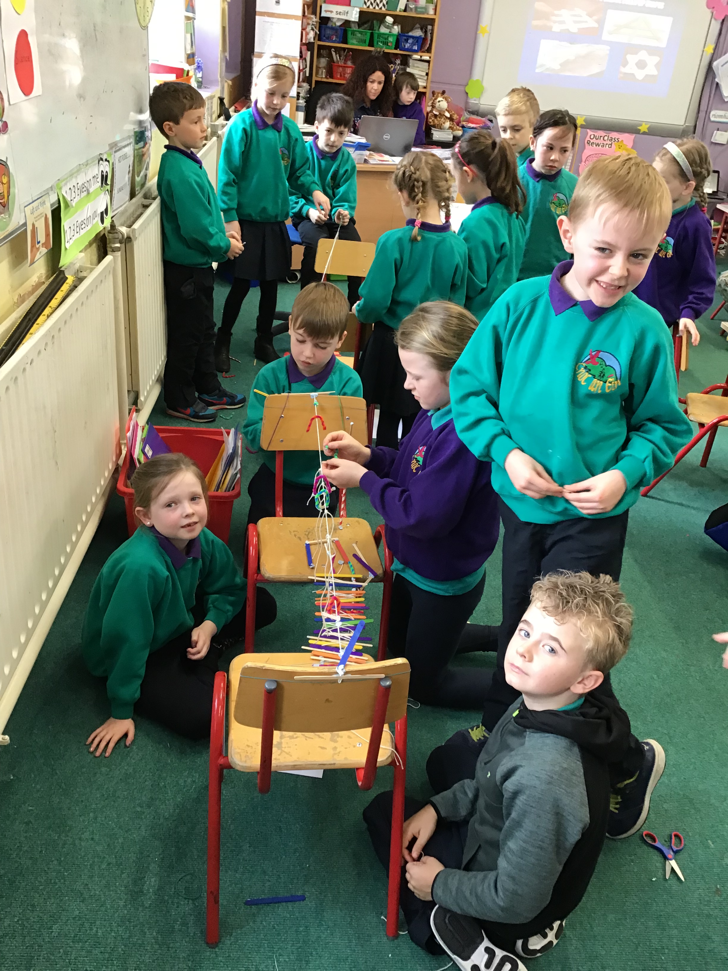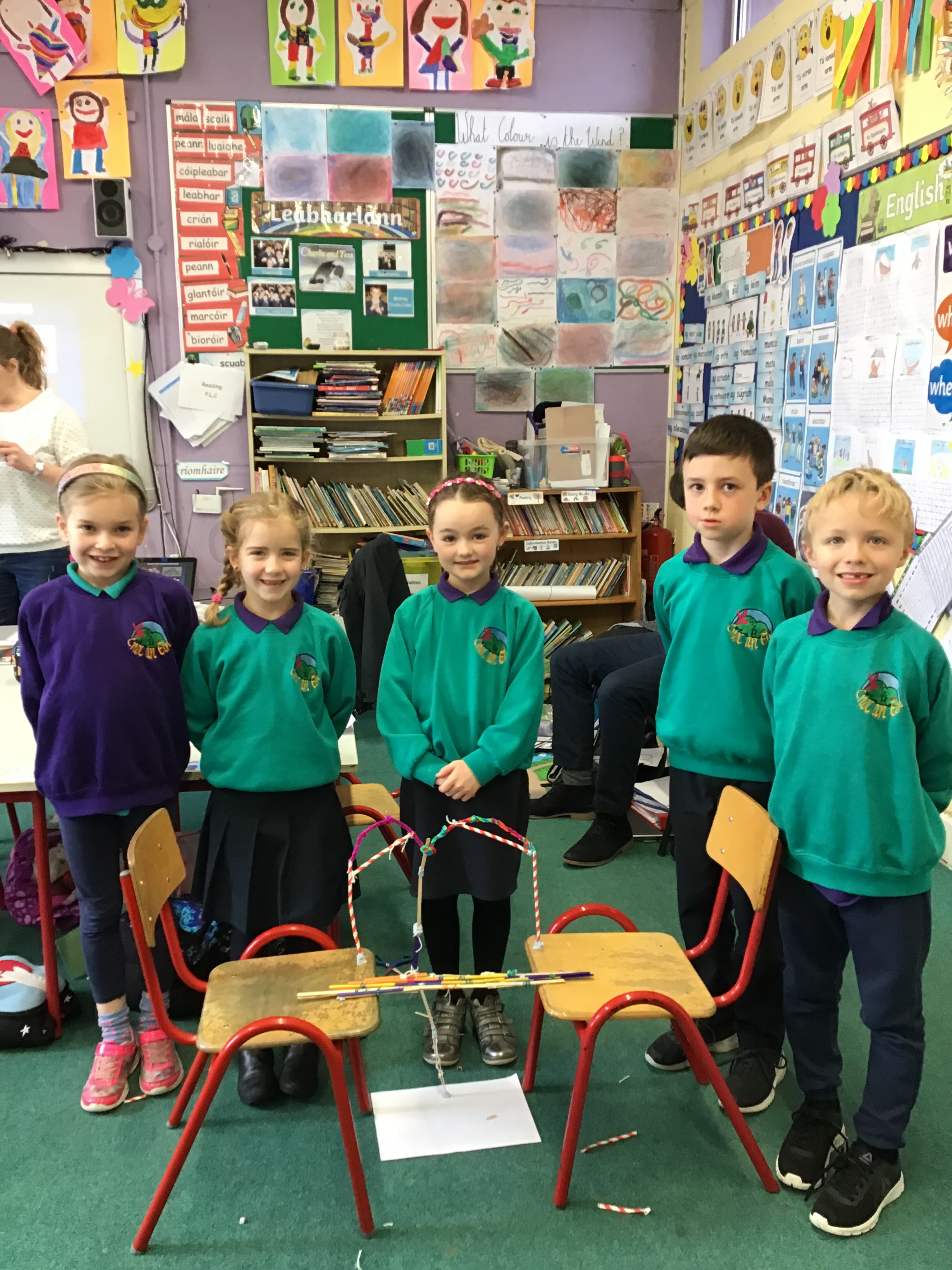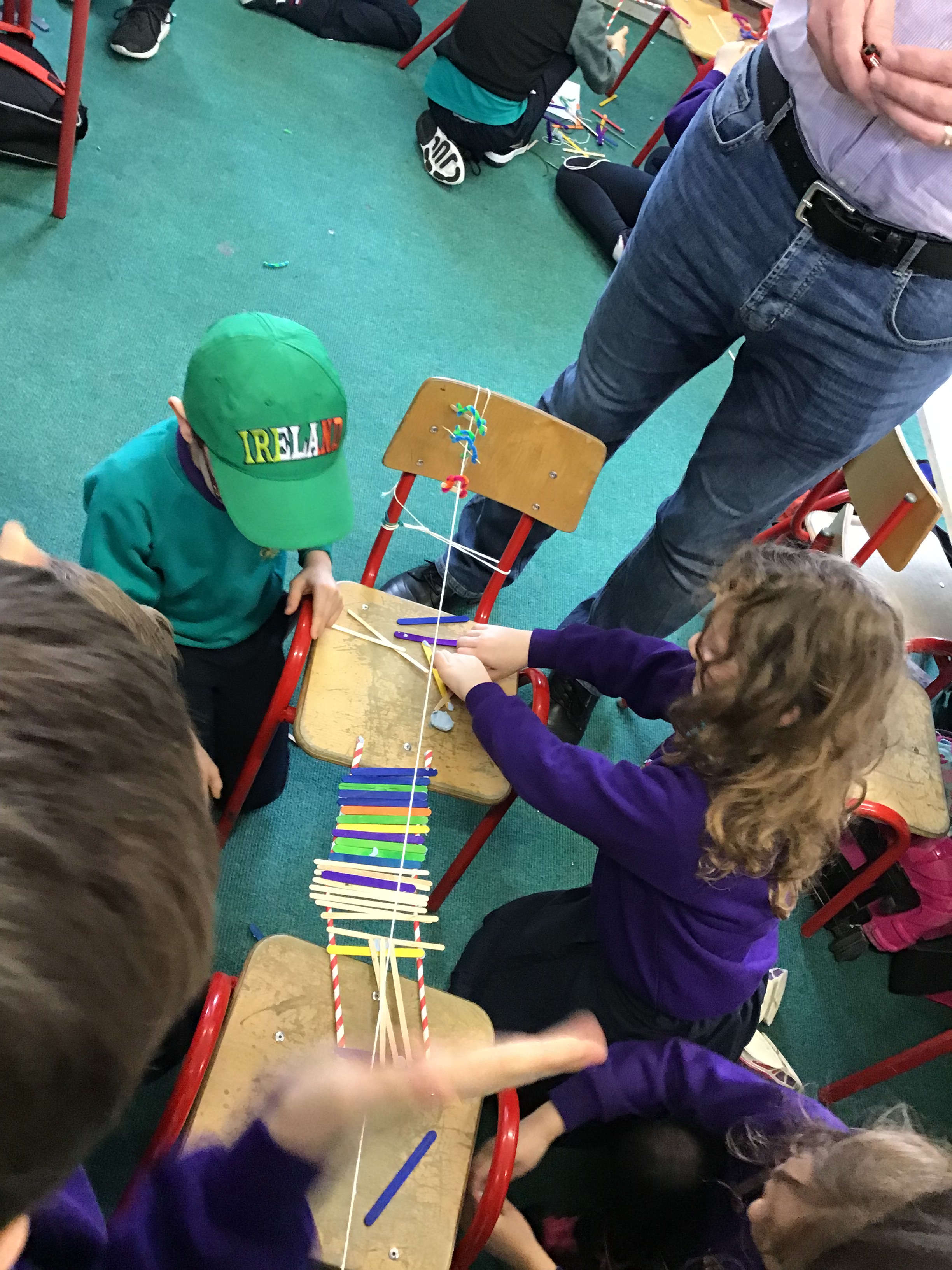 As part of engineers week’s, Adam Lehane’s dad came in to 1st class. He’s an engineer and he told us about engineering. He told us about bridges and how they are made and the different parts of bridges. He told us what he likes about his job which is talking to different engineers from different countries. He gave each group lots of different materials and told us to make bridges. We all made different bridges. People working in engineering have to wear bunny suits so that any dirt will show up. These bunny suits are kept in a special place and have to be washed every day. People working in engineering have to be very clean!
