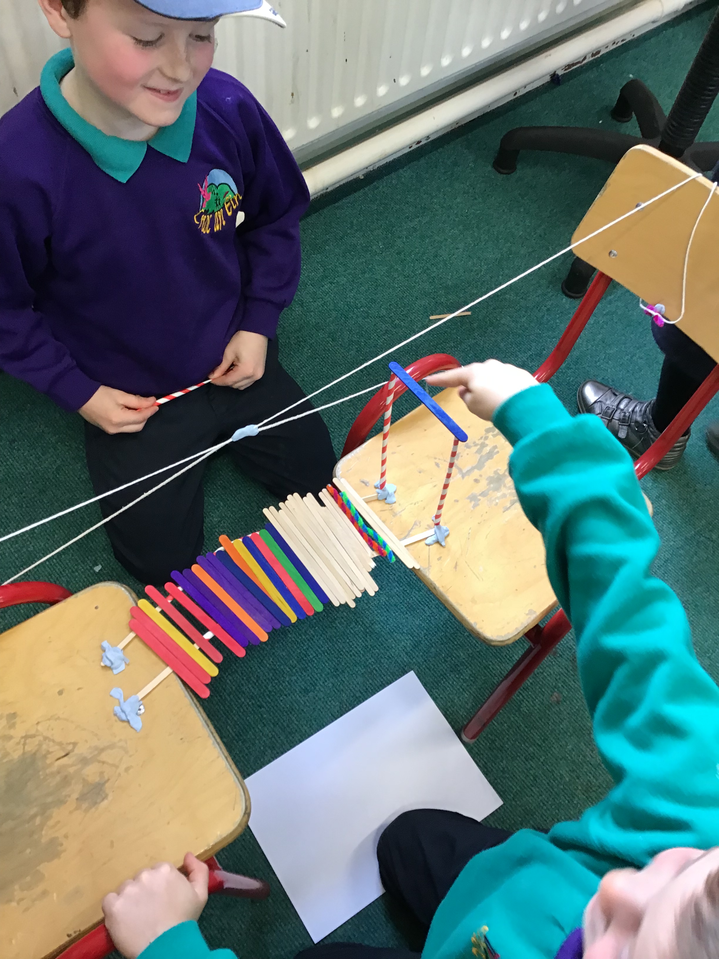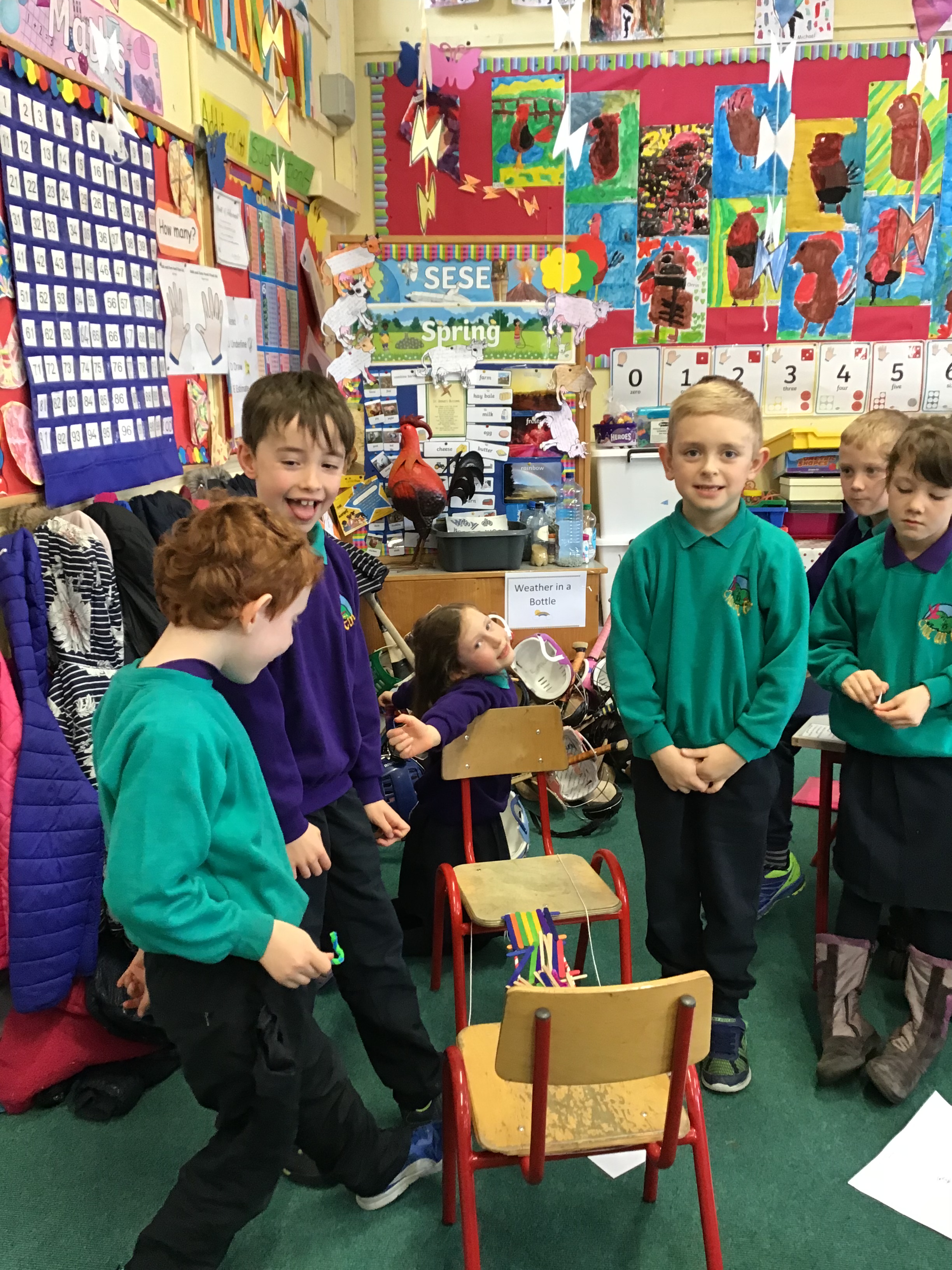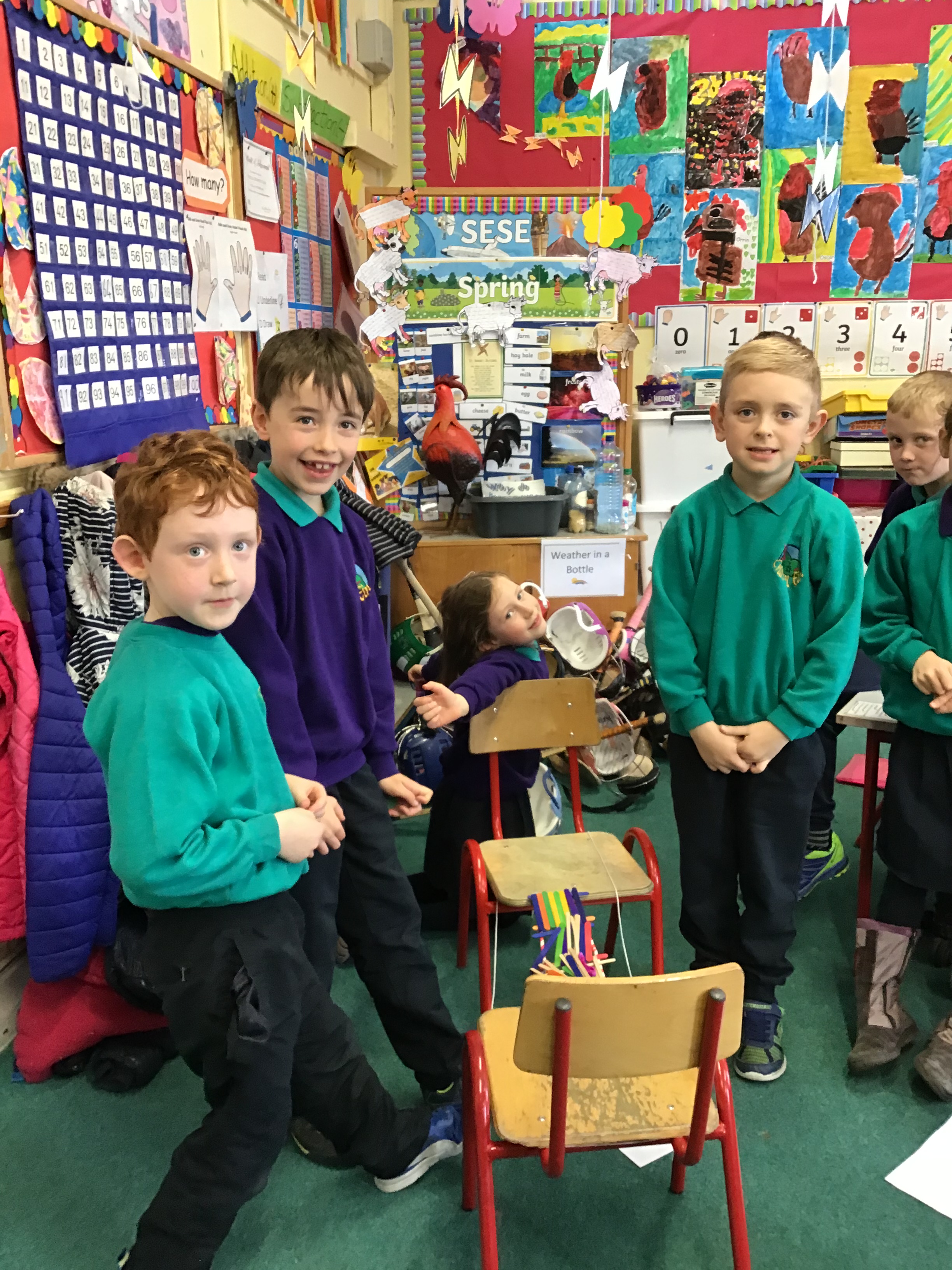 As part of engineers week’s, Adam Lehane’s dad came in to 1st class. He’s an engineer and he told us about engineering. He told us about bridges and how they are made and the different parts of bridges. He told us what he likes about his job which is talking to different engineers from different countries. He gave each group lots of different materials and told us to make bridges. We all made different bridges. People working in engineering have to wear bunny suits so that any dirt will show up. These bunny suits are kept in a special place and have to be washed every day. People working in engineering have to be very clean!