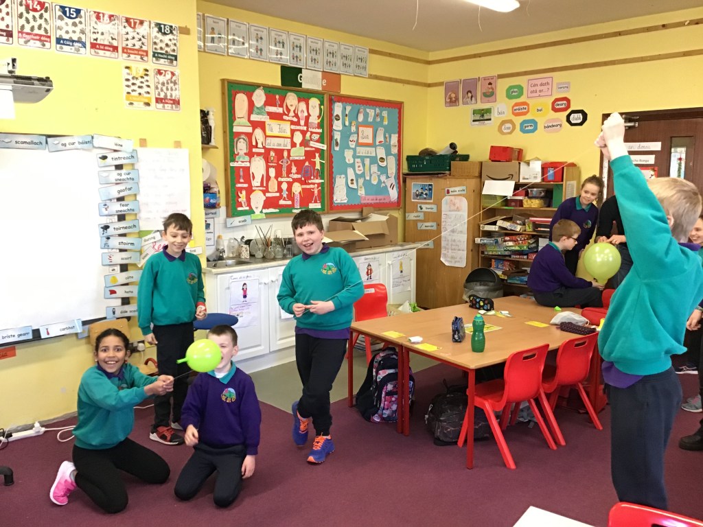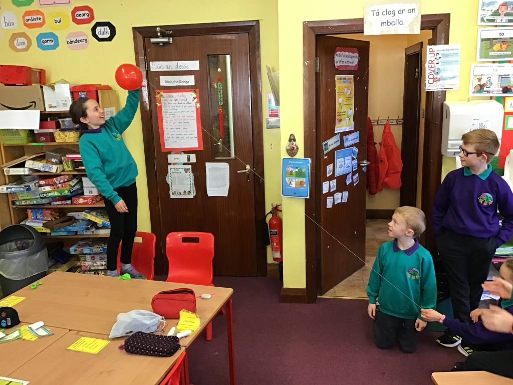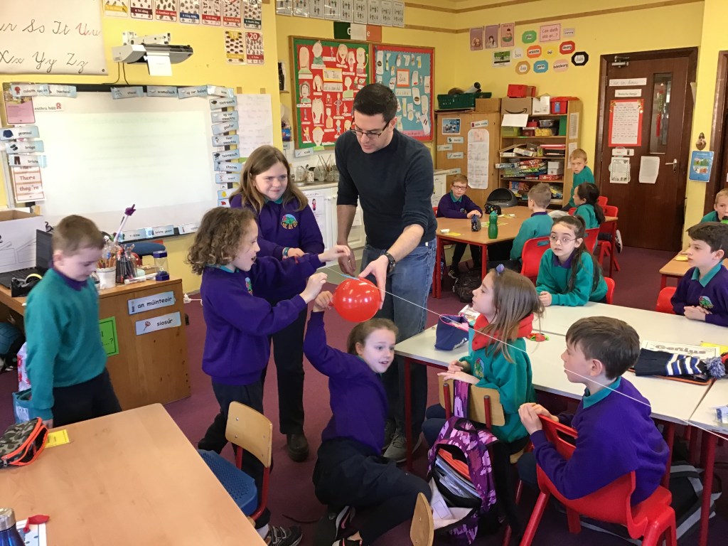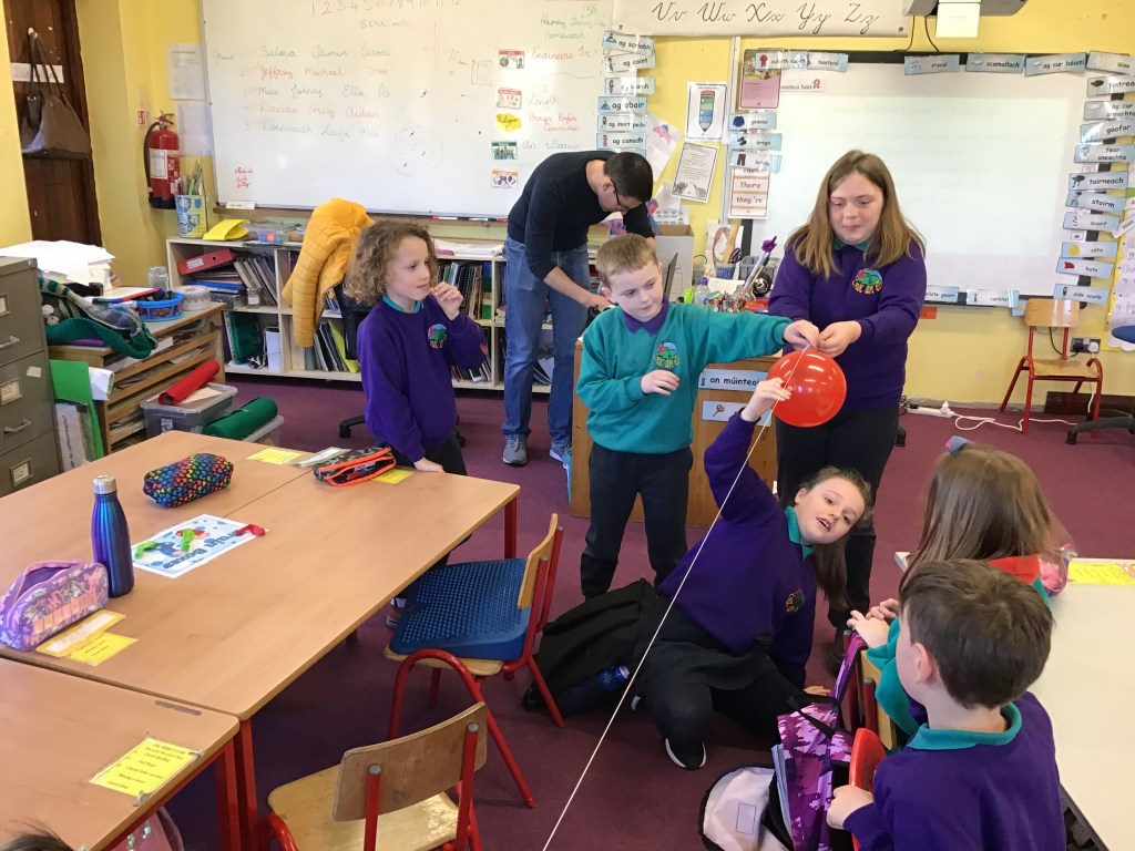 On Wednesday the 4th of March, two engineers called Robin Giller and Pat Lehane came to both 2nd classes. First, he showed us some pictures of quizzes and a computer chip. Then he demonstrated how to launch a balloon. After he showed us, we got a chance to launch our own balloons. One person blew up a balloon, two people held the ends of a piece of string and one other person put the straw on the string. The person who blew up the balloon held it close to the straw and taped it to the straw. Then they let go and it launched the balloon. We had great fun trying this.