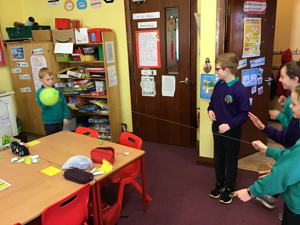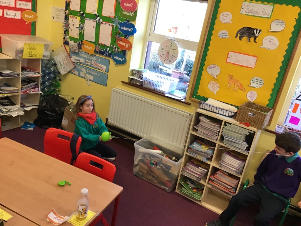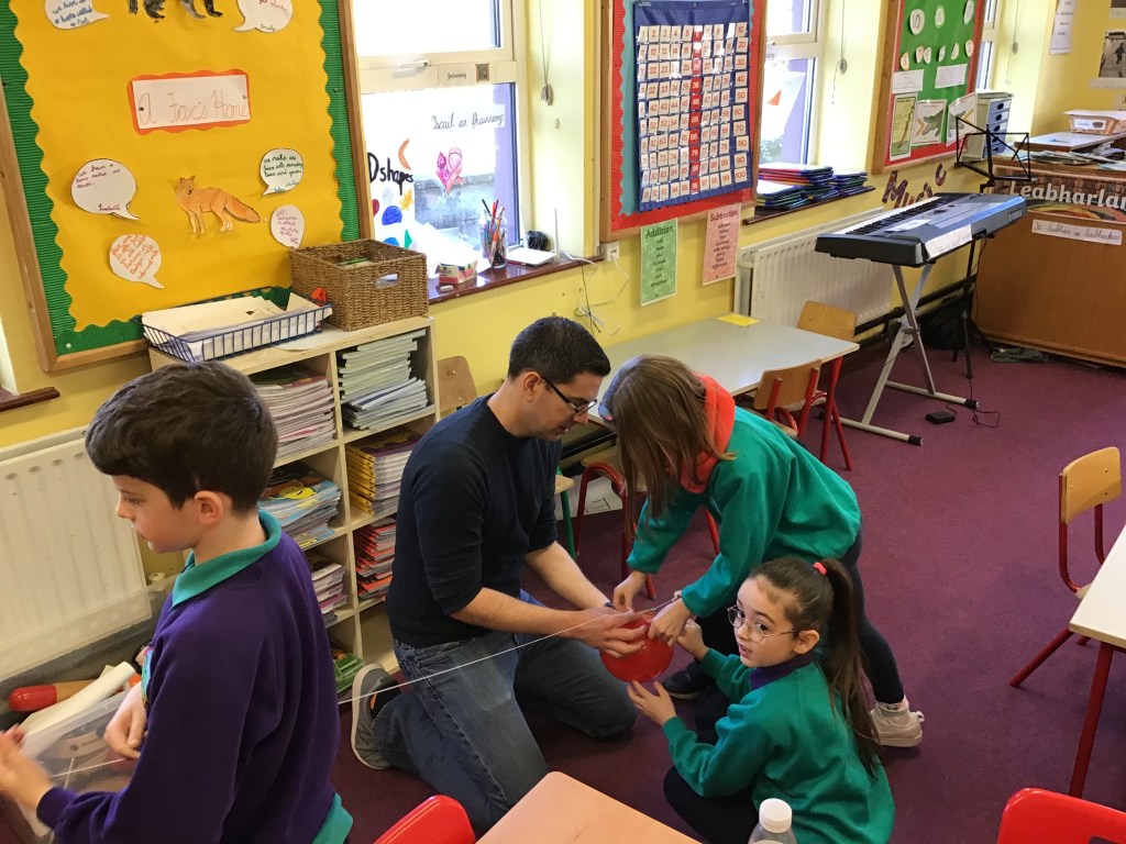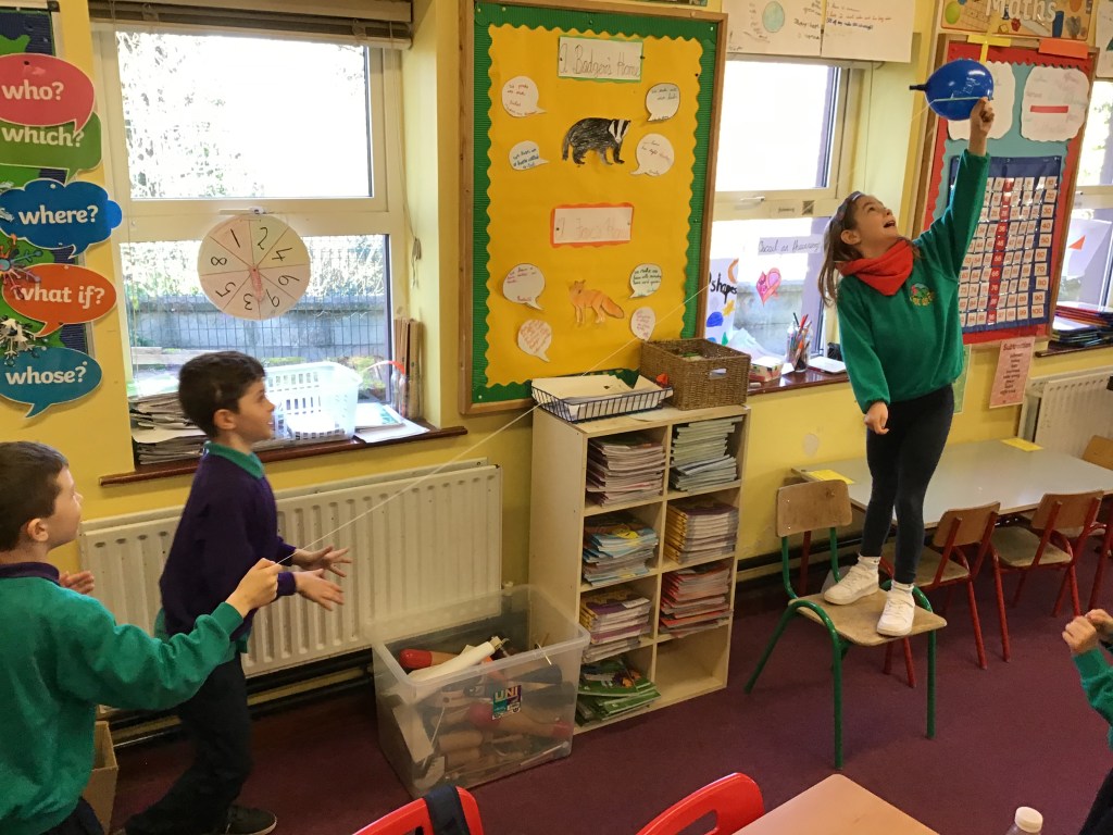 On Wednesday the 4th of March, two engineers called Robin Giller and Pat Lehane came to both 2nd classes. First, he showed us some pictures of quizzes and a computer chip. Then he demonstrated how to launch a balloon. After he showed us, we got a chance to launch our own balloons. One person blew up a balloon, two people held the ends of a piece of string and one other person put the straw on the string. The person who blew up the balloon held it close to the straw and taped it to the straw. Then they let go and it launched the balloon. We had great fun trying this.