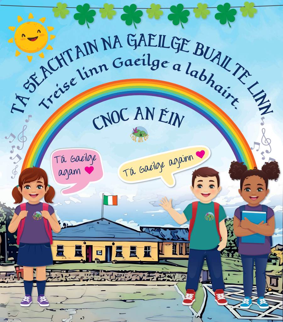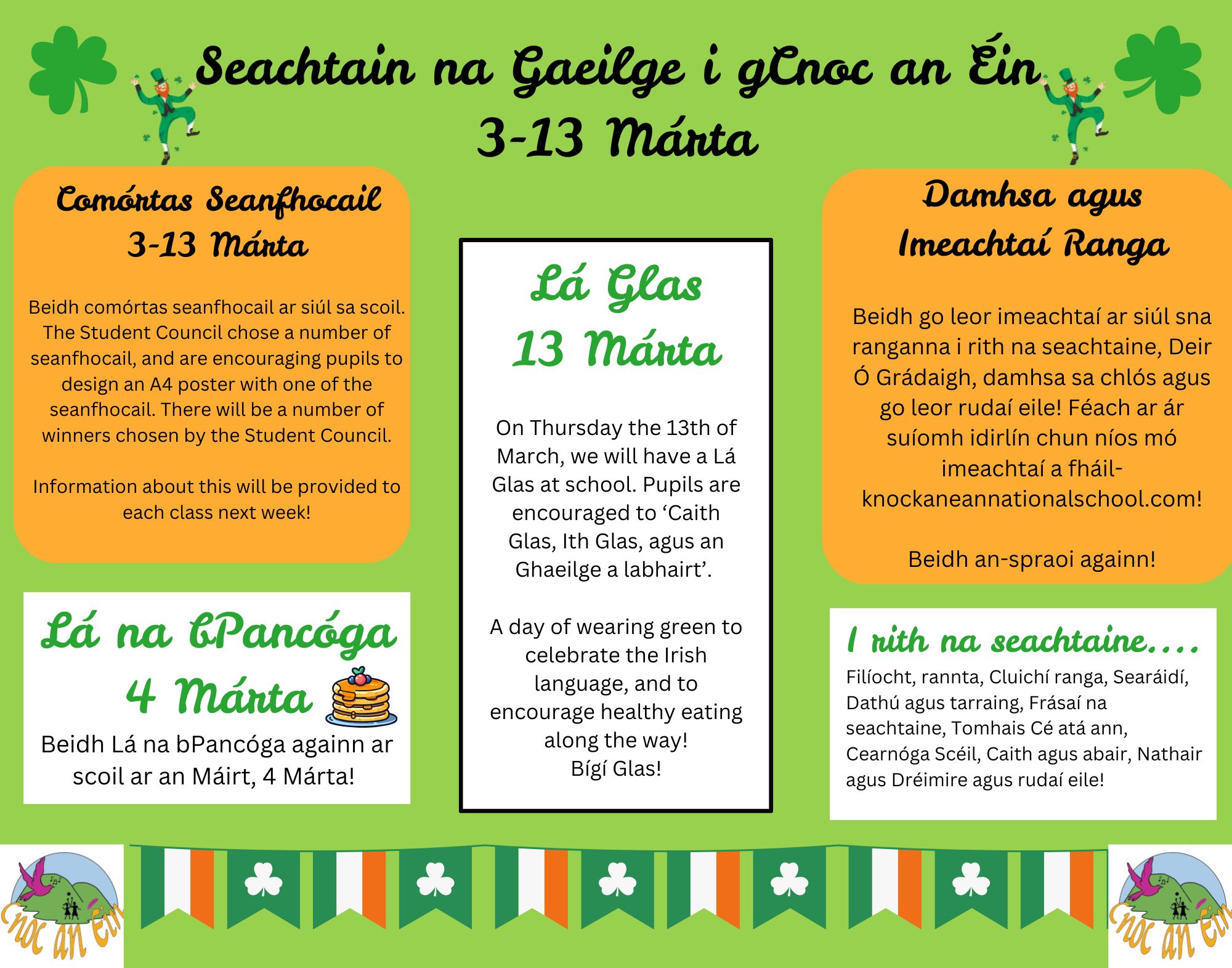 Táimíd ag céiliúradh Seachtain na Gaeilge i gCnoc an Éin, ón 3ú go dtí an 13ú Márta. Táimíd ag tnúth go mór le clár ama lán spéisiúil! Féach ar an gclár ama atá thíos luaite. Beidh spraoi agus craic againn i rith Seachtain na Gaeilge.