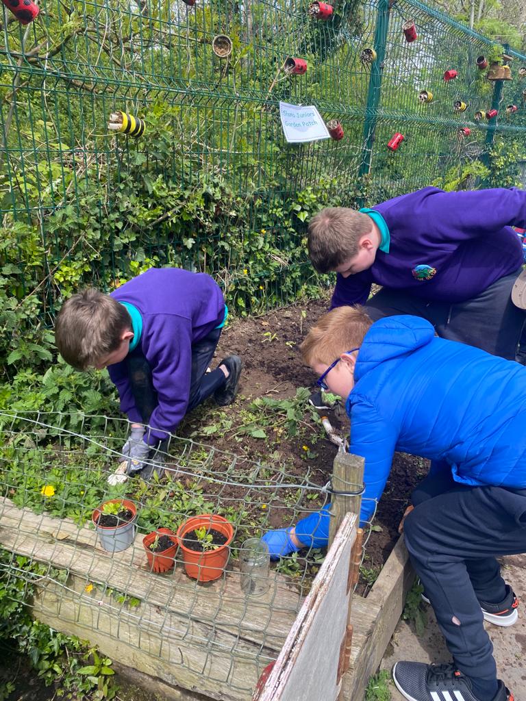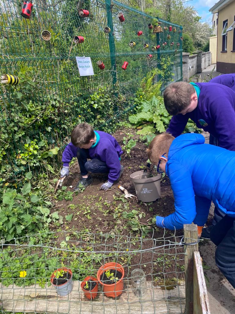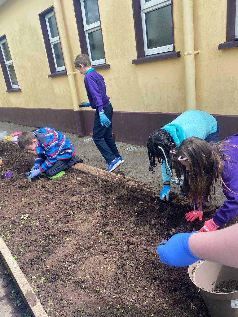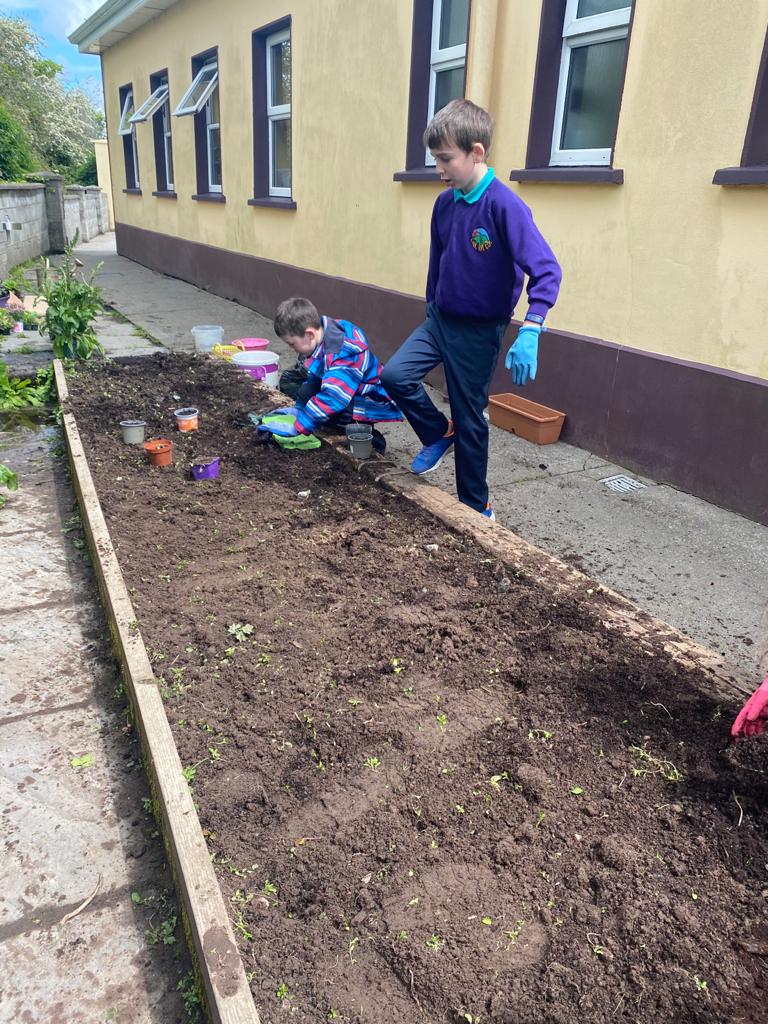 Spring is here and the green fingered children from third class have been busy sowing potatoes and readying the soil. Potatoes have been sown and window boxes prepared and planted. Rhubarb is ready for picking and strawberries are soaking up the sunshine. It’s a lovely time of year to watch the garden coming to life again.