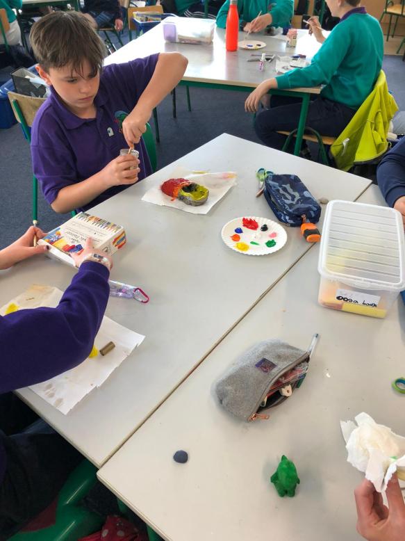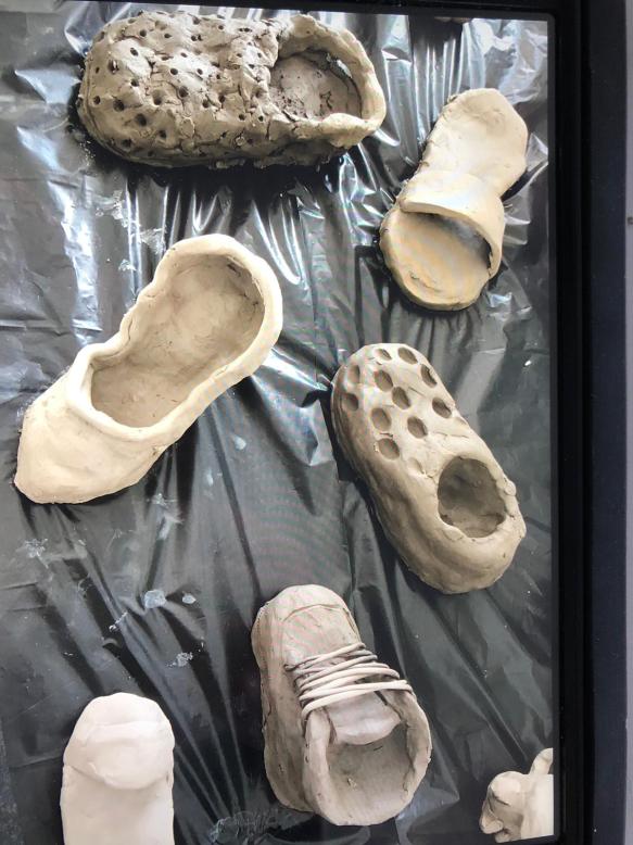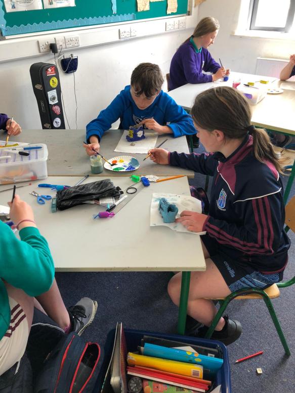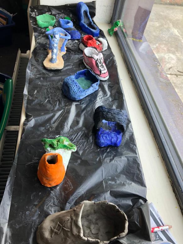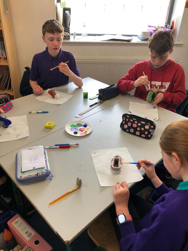 With the travel theme in their heads the sixth class decided to put their creative fingers to work with clay to make different types of shoes. Having moulded and shaped their shoes they then painted them. I think you’ll enjoy the results. There might be a Louis Vuitton in our midst. Watch this space!!!