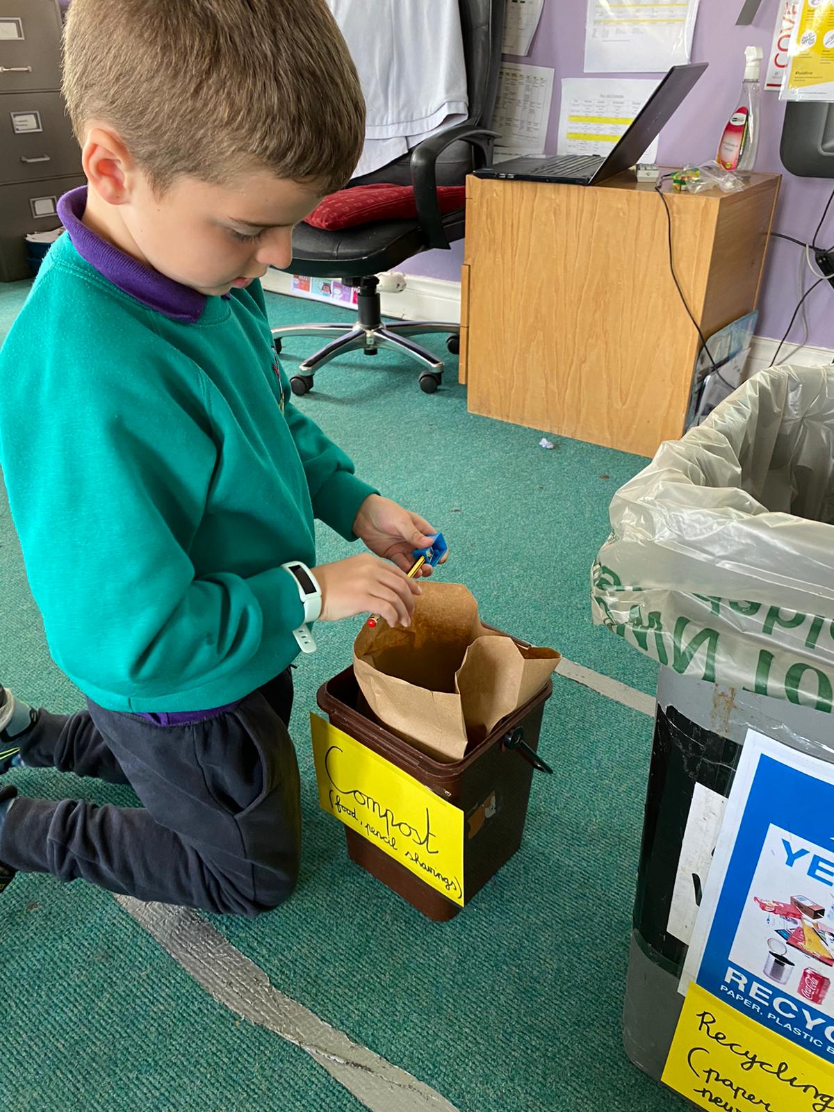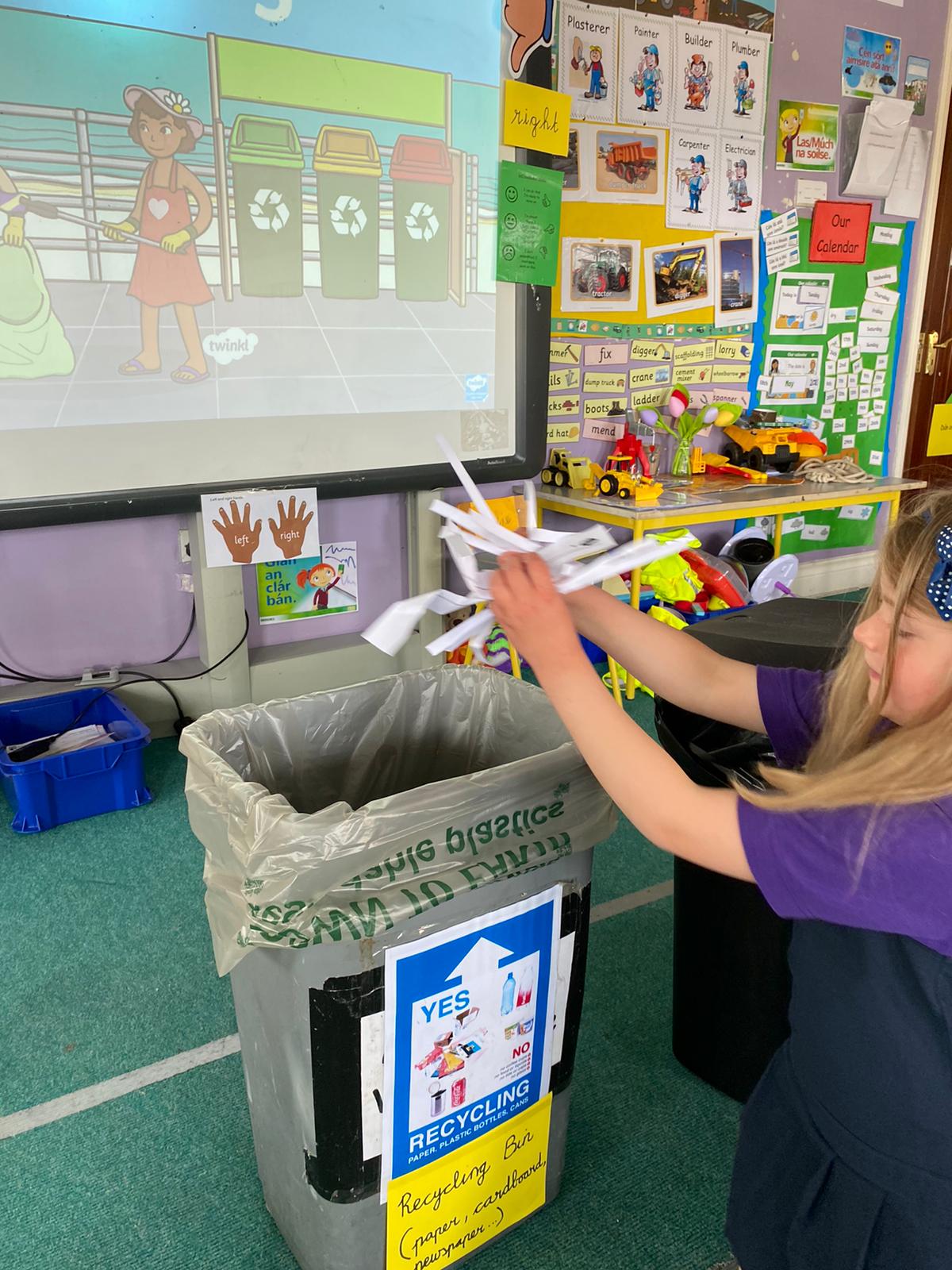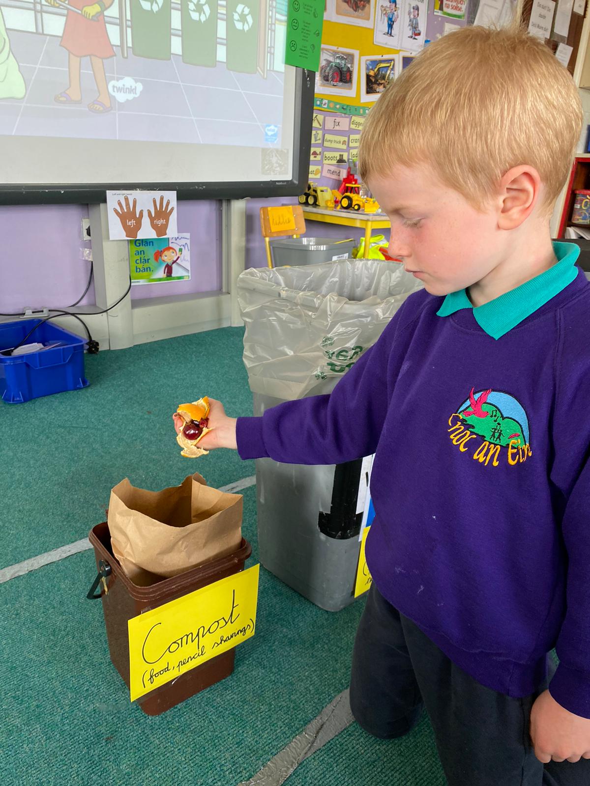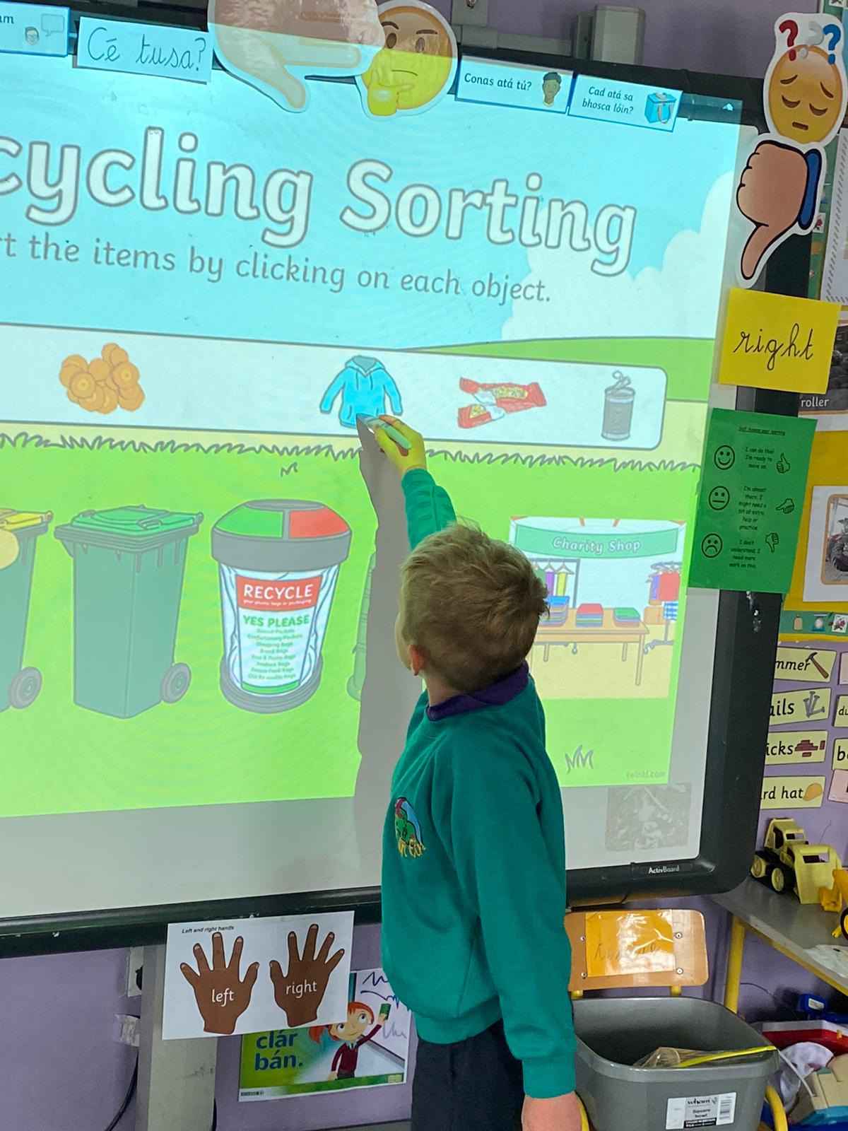 The senior infants have been learning about waste and recycling too. They engaged in a rubbish sorting activity and had to decide which bin the items would go into. They also learned about the different ways you can save water, and they made a lovely writing display.