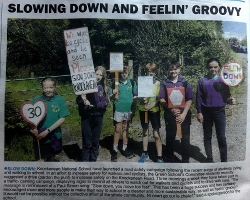 From 97% travelling by car down to 56% was something to celebrate. The Green Schools Committee recognised the importance of their campaign to keep the children of our school safe on the road to Knockanean.