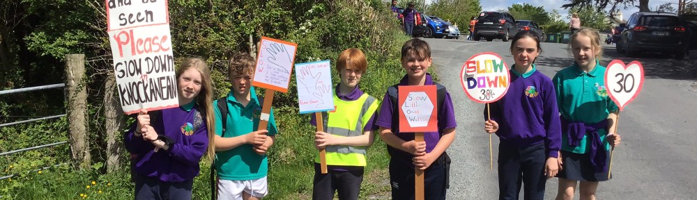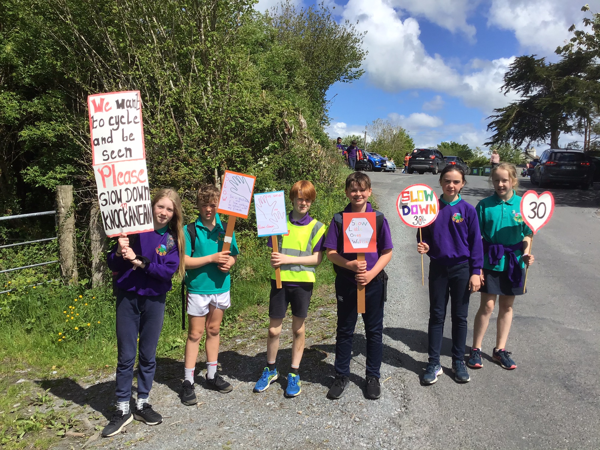 Every Monday, Wednesday and Friday morning, the committed Green Schools members along with members of the school staff stand on the roadside to remind drivers to reduce their speed. They have seen a difference from their presence on the roadside. It has been decided to continue for the remainder of the school year.