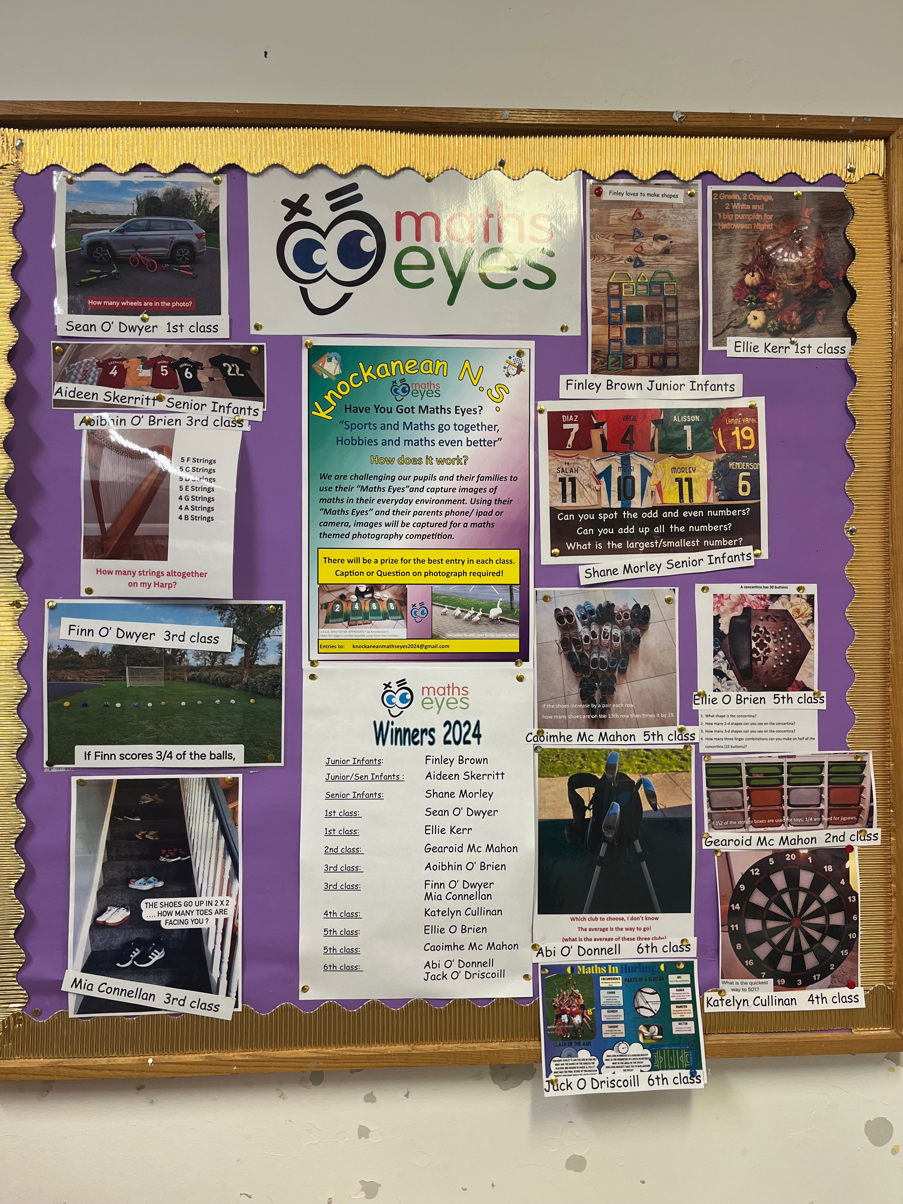 The winners of the ‘‘Maths Eyes” competition which took place before the Halloween break were announced this term. We all gathered around Tina’s classroom to hear who the lucky winners were. Tina congratulated everyone who took part and explained how it was so hard to pick winners as there were so many wonderful entries. Well done to the following winners: Junior Infants- Finley Brown Junior Infants/Senior Infants- Aideen Skerritt Senior Infants- Shane Morley First Classes- Ellie Kerr and Seán O’Dwyer Second Class- Gearóid McMahon Third Classes- Mia Connellan, Finn O’Dwyer and Aoibhín O’Brien Fourth Class- Katelyn Cullinan Fifth Classes- Caoimhe McMahon and Ellie O’Brien Sixth Class- Jack O’Driscoll and Abi O’Donnell.