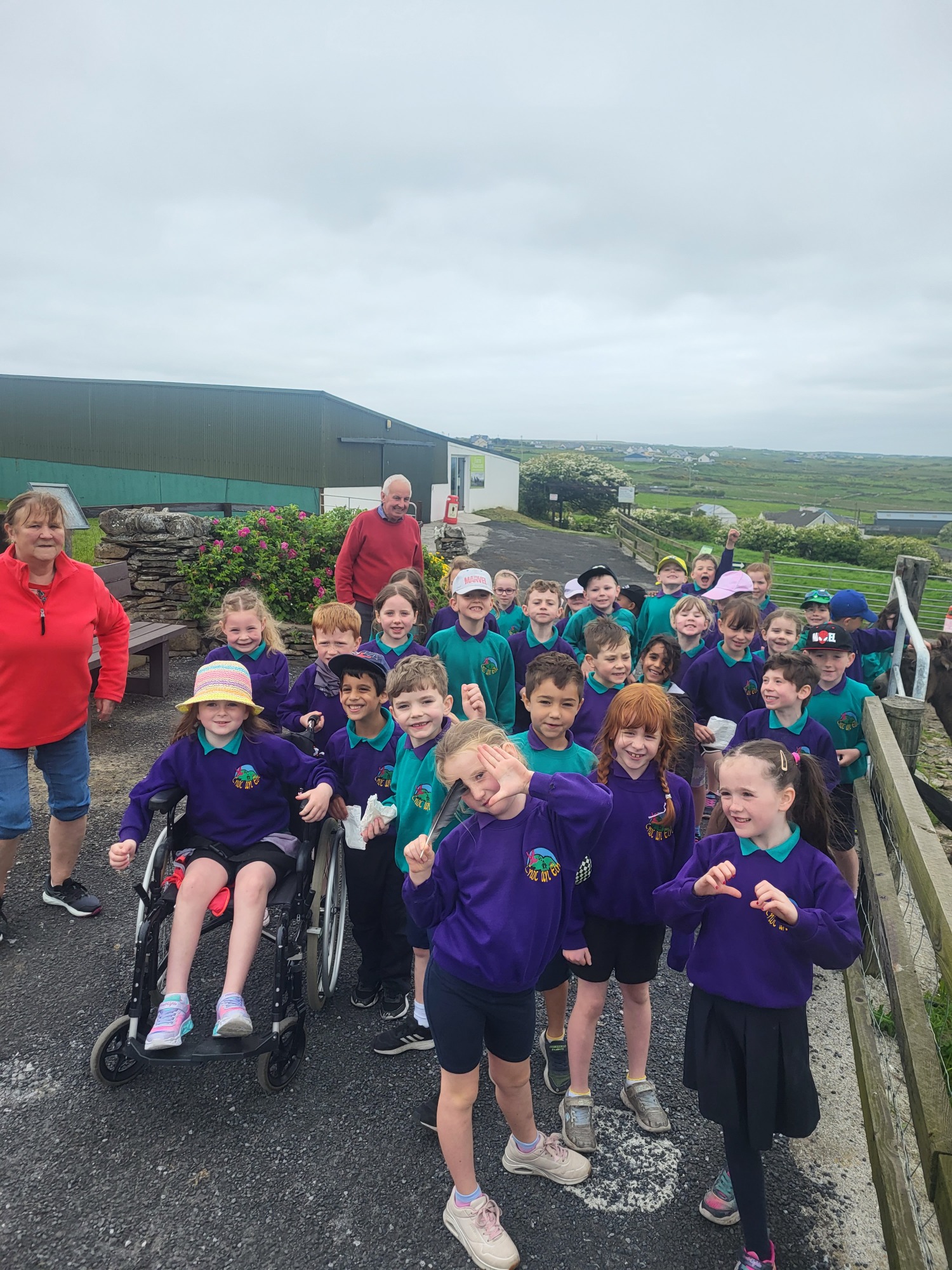 On Tuesday 21st June we went to Moher Hill farm on School Tour with Niamh, Sinéad, Claire, Louise and Ursula. We all got on a big bus and waved goodbye to everyone. First we stopped at Lahinch and went to the playground there, after that we went to down to beach and sat on the rocks to eat our lunch. We then got back on the bus and went to the farm. We got to do loads of different fun activities there. We drove go karts, played in giant sandpit, a bouncy castle, a ball pit and a playground. We were so busy having so much fun. We went on a walk through a fairy garden, and then Martin the farmer brought us on a big walk to meet all the animals. He gave everyone a little bag of animal food. We saw lots of animals, lambs, sheep, goats, racoons, ducks, deer, bunnies, guinea pigs, turtles, ponies and we left little bits of food on the fences for them to eat. Some of us were really brave and even let the animals eat out of our hands. At the end of the walk Niamh tried to feed the Emu. She was really scared at first because the emu had a sharp beak but she got brave and fed him, we all cheered. At the end of the tour we got back on the bus to go home. We had a great day and would love to meet the animals again.